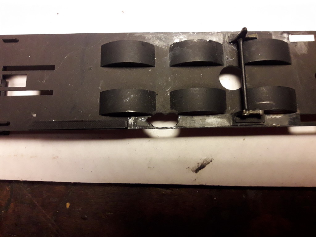 Il faut évidemment gratter les lettres et chiffres en relief Après: J'équipe le châssis de palpeurs pour la liaison électrique avec le tender J'arrase toutes les superstructures du tablier (pompe, compresseurs, turbo dynamo, graisseur Bourdon...) sauf le levier de commande de la coulisse. De même j'arrase et je bouche les fanaux avec du Sintofer, masticage et façonnage.