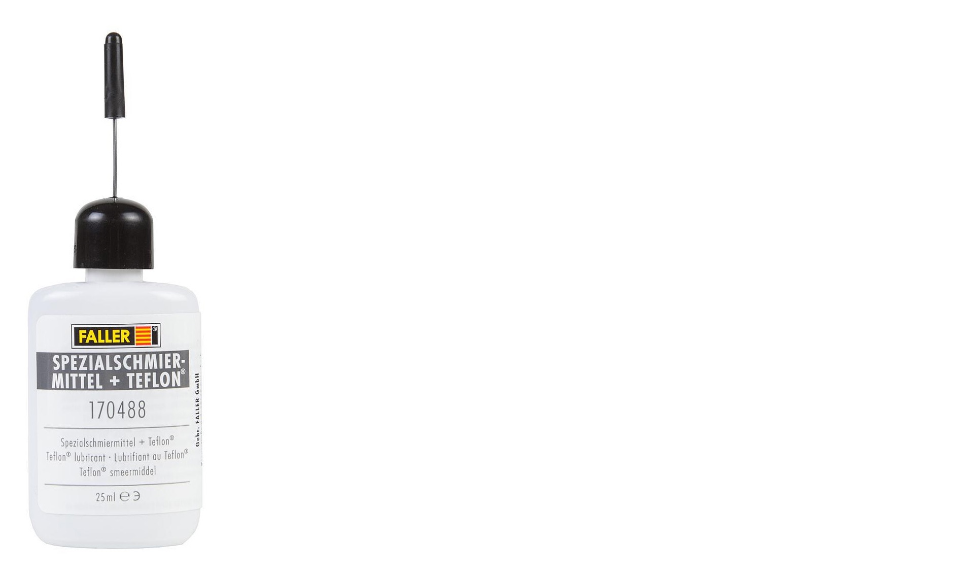 Remarque : Le lubrifiant spécial FALLER + Teflon (170488) convient parfaitement pour lubrifier l'ensemble des pièces en plastique (polystyrène etc.) des modèles réduits, notamment pour toutes les pièces mobiles des articles de kermesse, les essieux directeurs et les boîtes de vitesse des véhicules du Car System de Faller, les entraînements de porte et les roues de moulin.