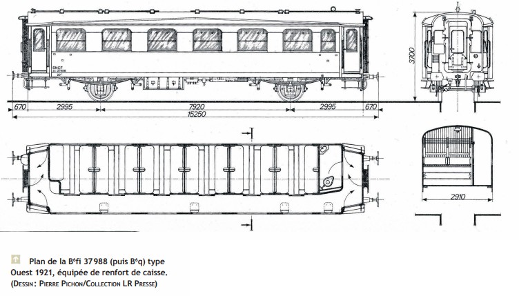 Concernant les voitures à droite (6), vous mentionnez OCEM RA et F, et ensuite voiture à deux essieux type Ouest sans intercirculation différente des voitures semi métallique à deux essieux à intercirculation, est ce que cela correspond aux références B7qz 37 960 (ex-B7i) type OUEST 1914/15 ( 7 compartiments) et le type OUEST 1920 ?(6 compartiments). Ce que je ne comprends pas c'est que l'auteur mentionne comme longueur hors tampons 15,85 m pour 7 compartiments, alors que la version 6 compartiments mesure 15,25 selon le plan et 15,270 selon l'article, une si petite différence avec 1 compartiment de plus ?