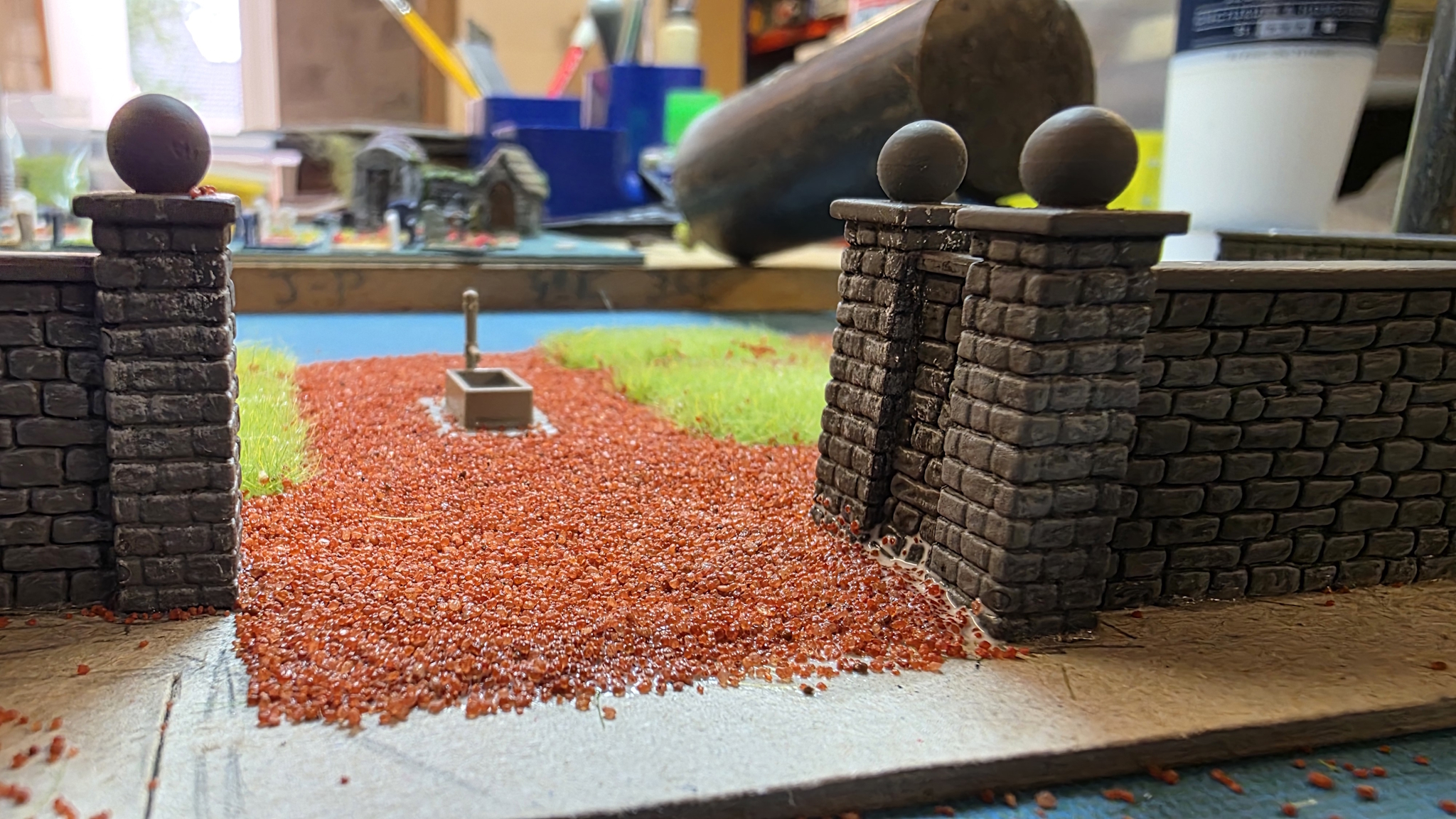 Ce la m'a pris une bonne partie de la matinée pour tous les faire Puis ensuite peinture grise pour les routes, j'attends que cela sèche avant de leur passer un petit coup de patine pour les salir un peu