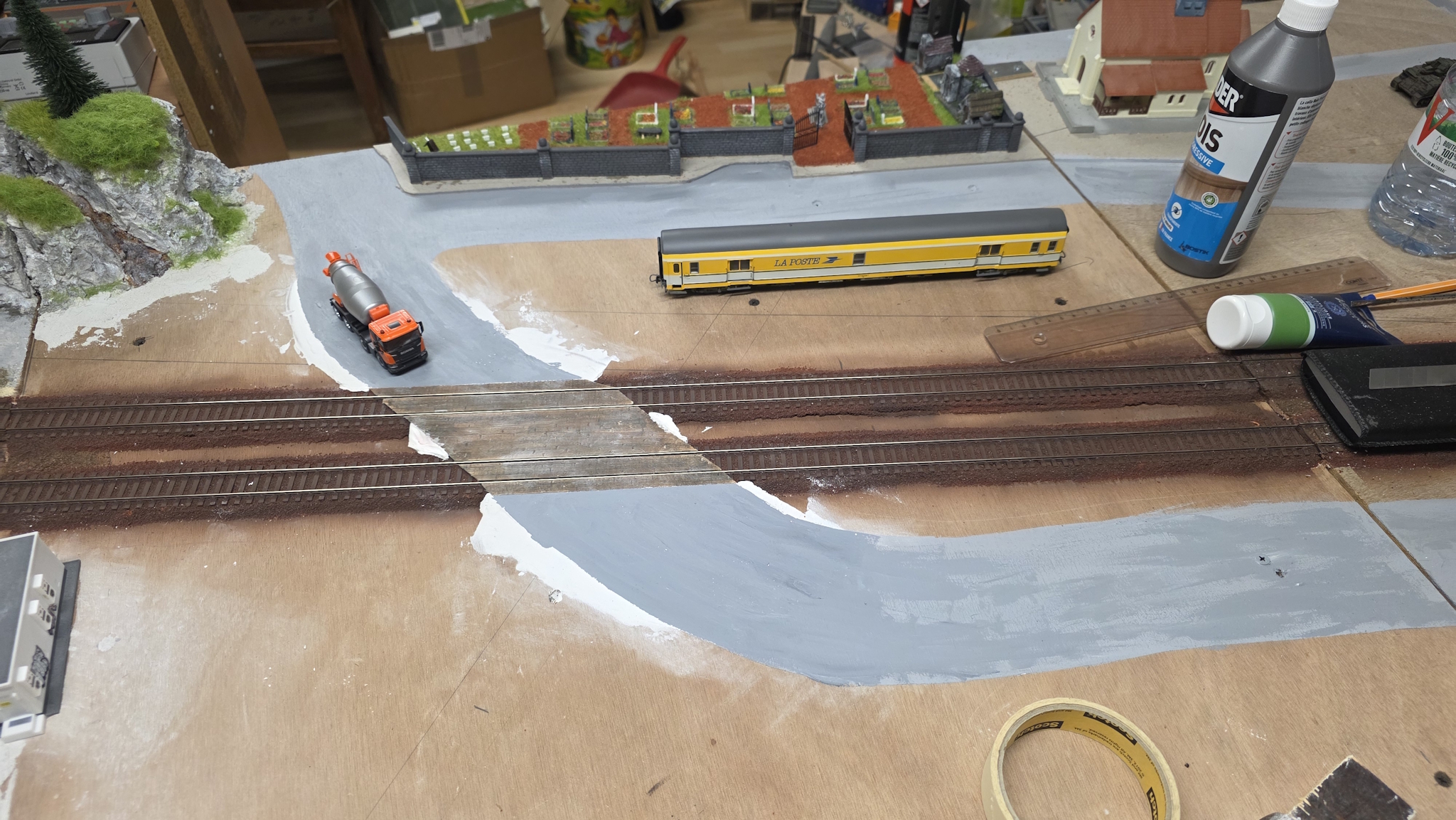 J'ai essayé avec du sable de mer. Pour le teinter, j'ai mis la poudre colorante à sec dans un récipient fermé et j'ai secoué. Ensuite, j'ai saupoudré sur la surface déjà enduite de colle blanche diluée à 50% avec une cuillère à café. C'est le cas de mes pistes longeant la voie et du groupe de signalisation.