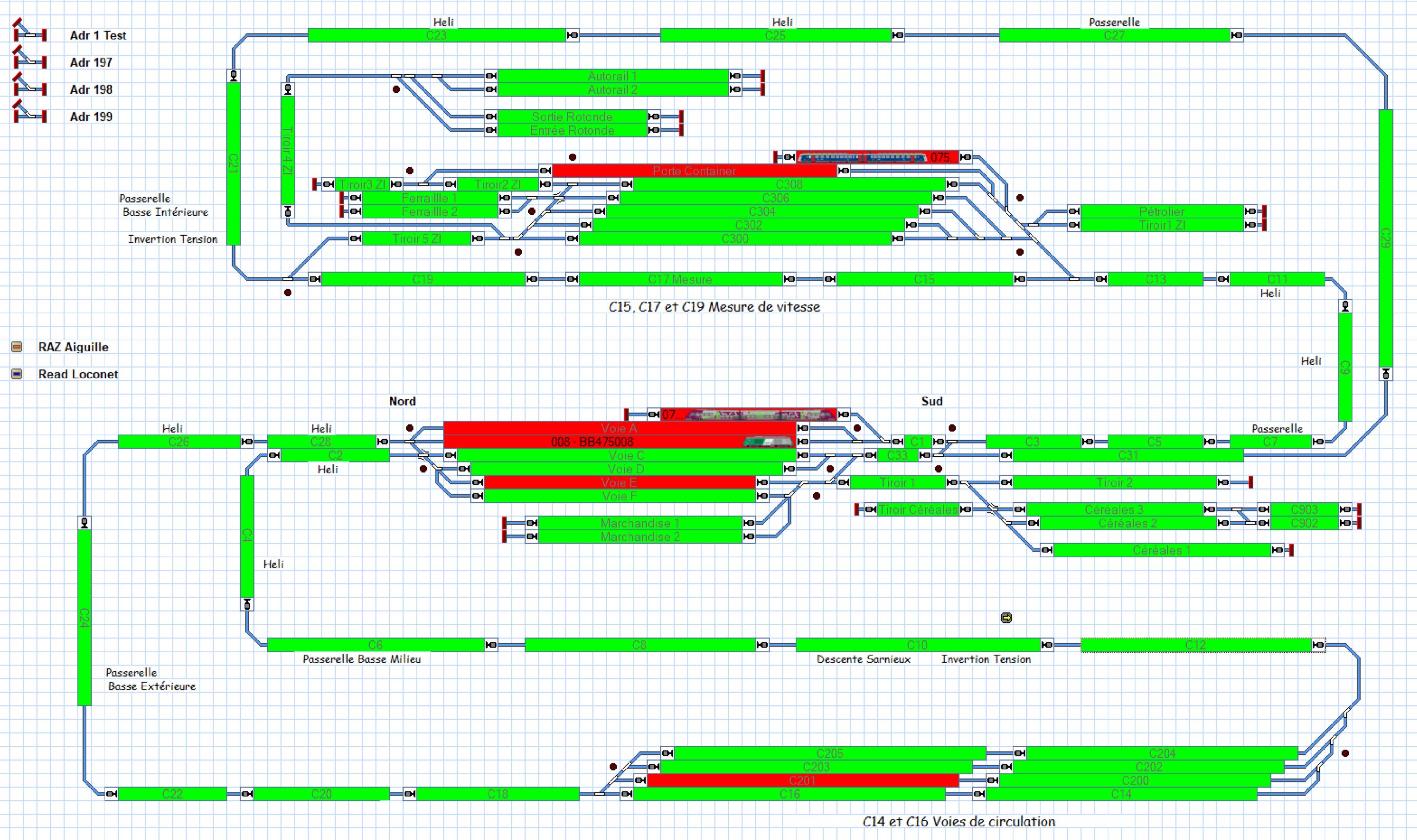 pour la voie principale soit 15 trains simultanés ou 30 à la queue leu leu; J'ose pas imaginer le stress quand çà va tourner à plein régime. Déjà avec 4 simultanés chez moi je flippe à l'écoute du doux claquement d'un essieu sur les traverses alors 15 trains ...