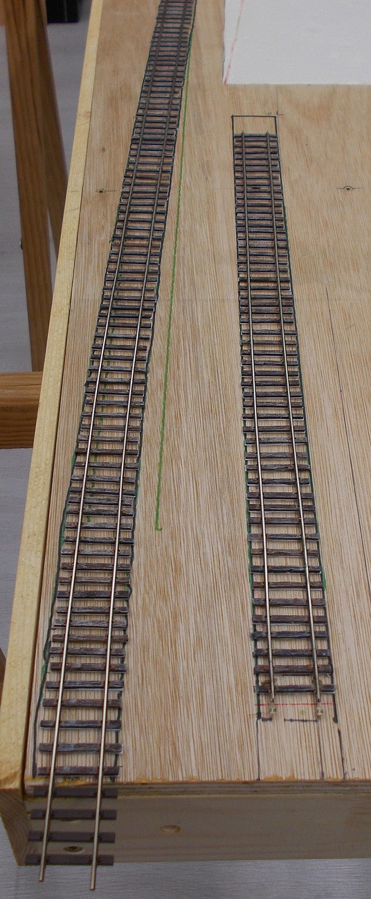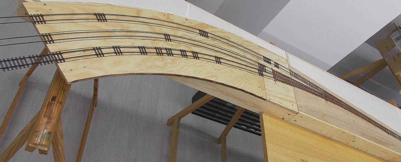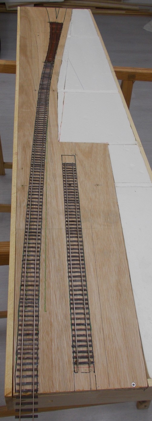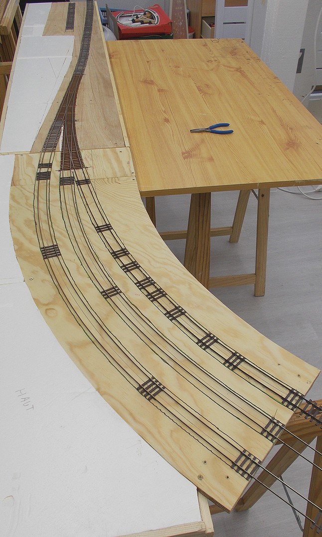 La voie en courbe du fond avec 2 coupures me permettra de stocker 2 rames d’1 m chacune, la voie du milieu me servira de voie de passage, la première coupée en 3 segments de 45 cm assurera le rangement des rames courtes ou des autorails.