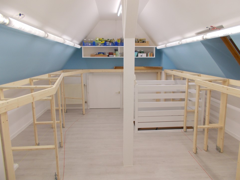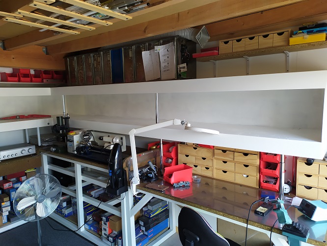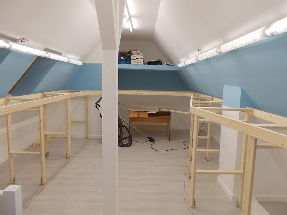 L’infrastructure sur laquelle reposeront les modules est à peu près terminée. L’endroit où est le bureau n’est en suspens (il manque la structure du réseau du bas) car un poste de travail déplaçable sera glissé en-dessous.