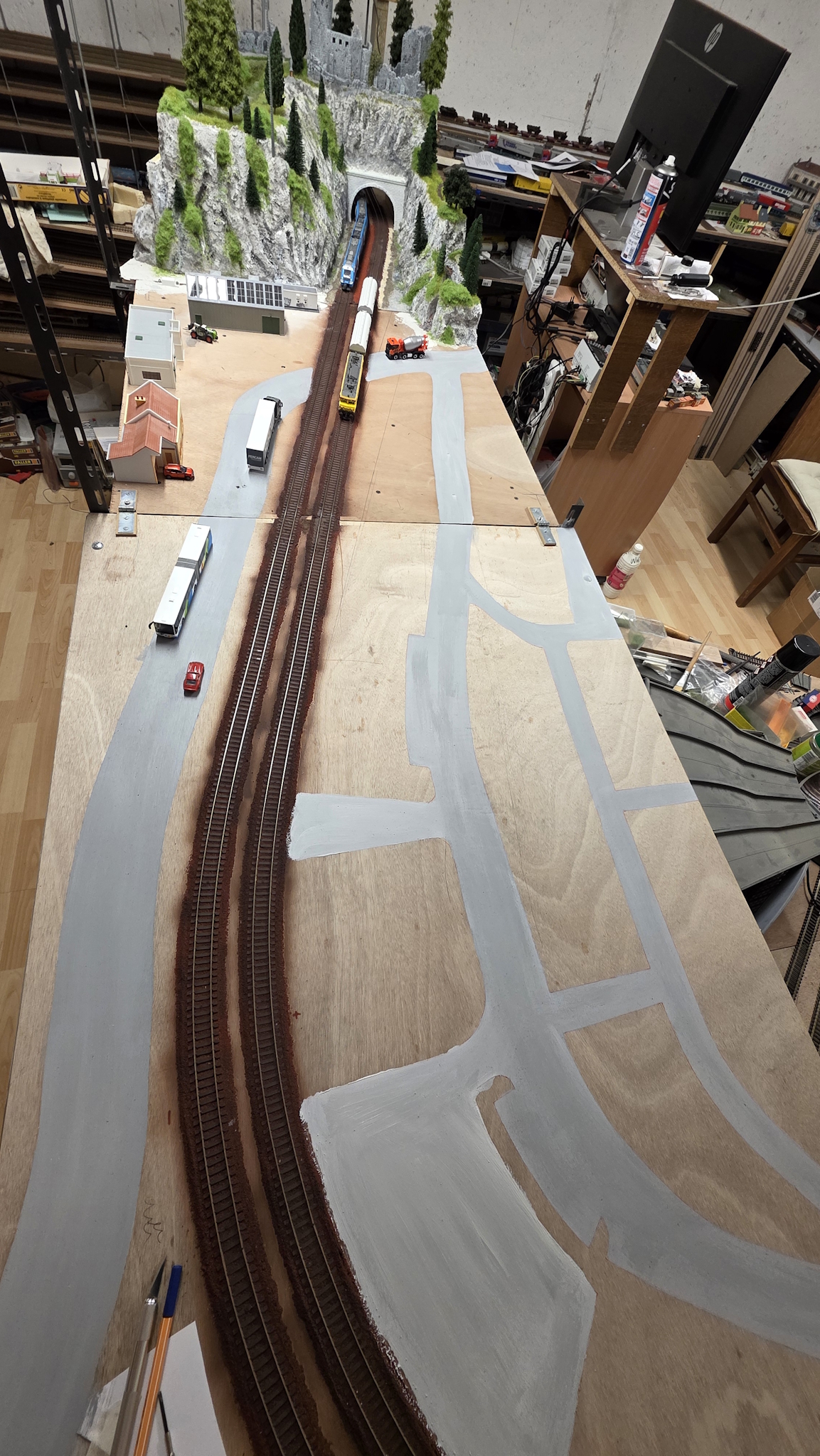 Bon comme c'est gênant pour mon dos d'être en extension par dessus les 2 voies en premier plan, j'ai déporté la réalisation sur un morceau de styrodur