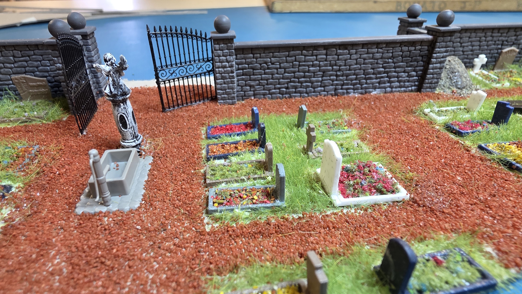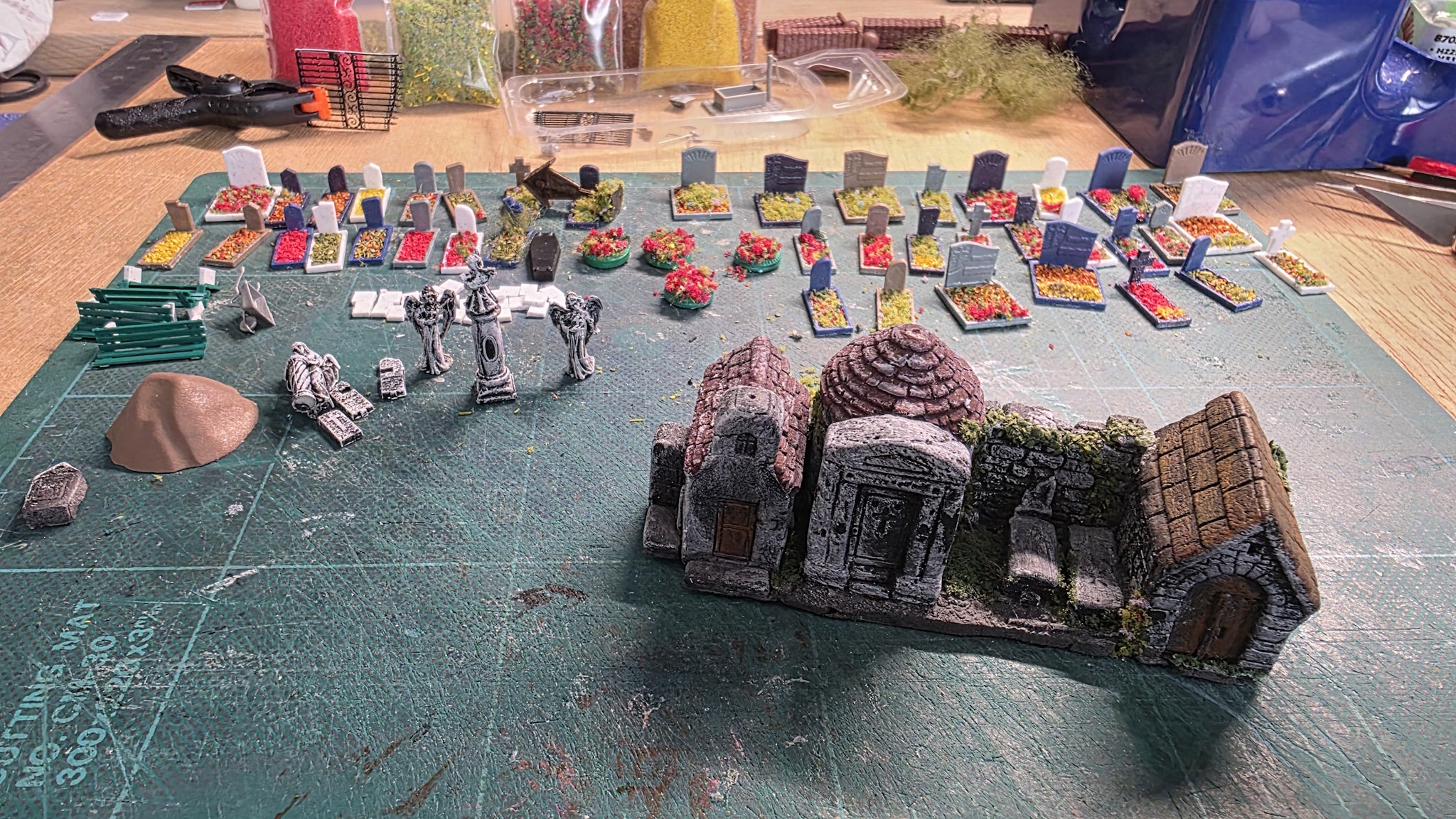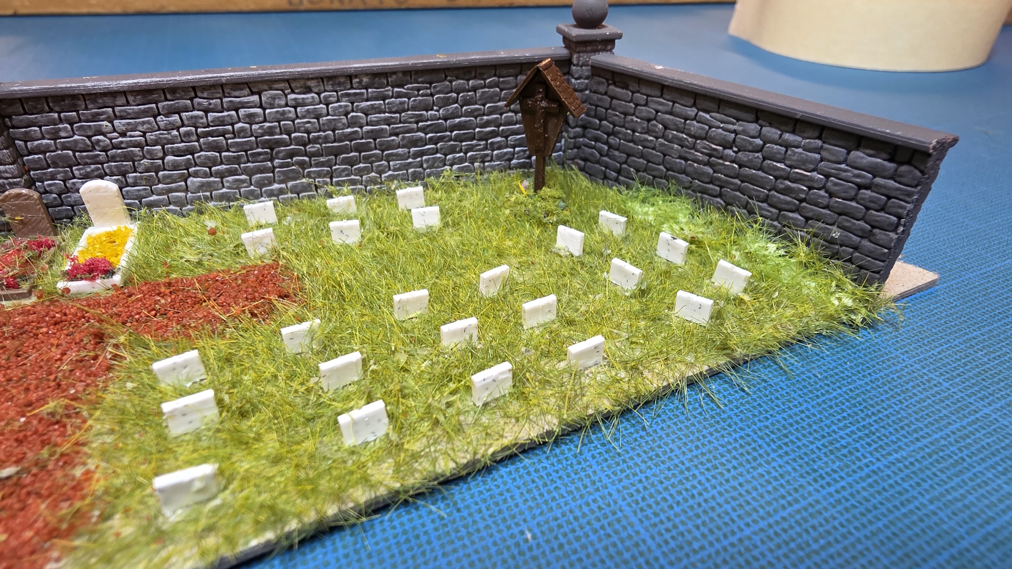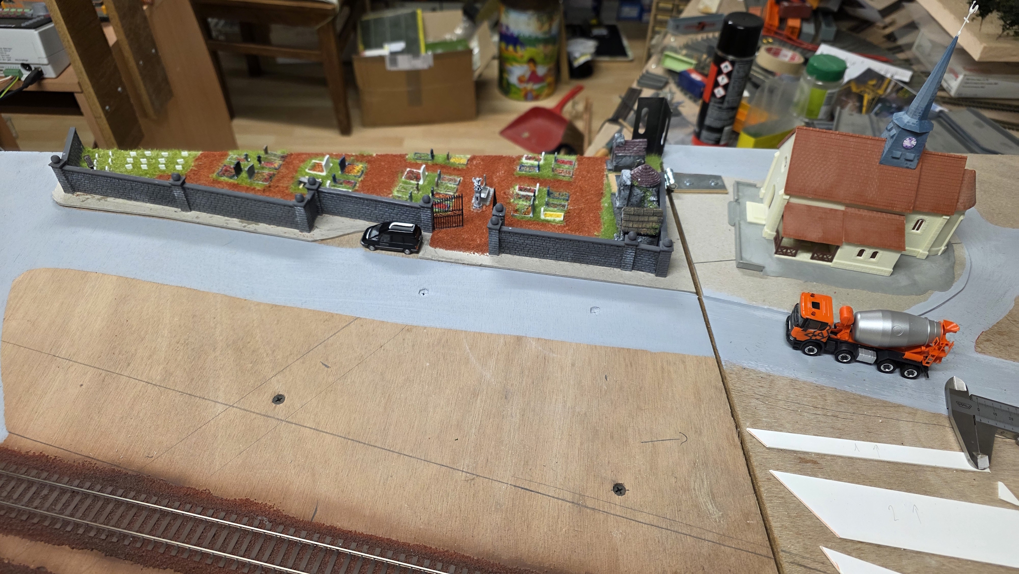 Il attendait enfin la création du cimetière, du coup montage des éléments Puis j'ai charcuté un vieux cimetière Noch qu'au départ je voulais mettre vers La Tour au dessus du tunnel