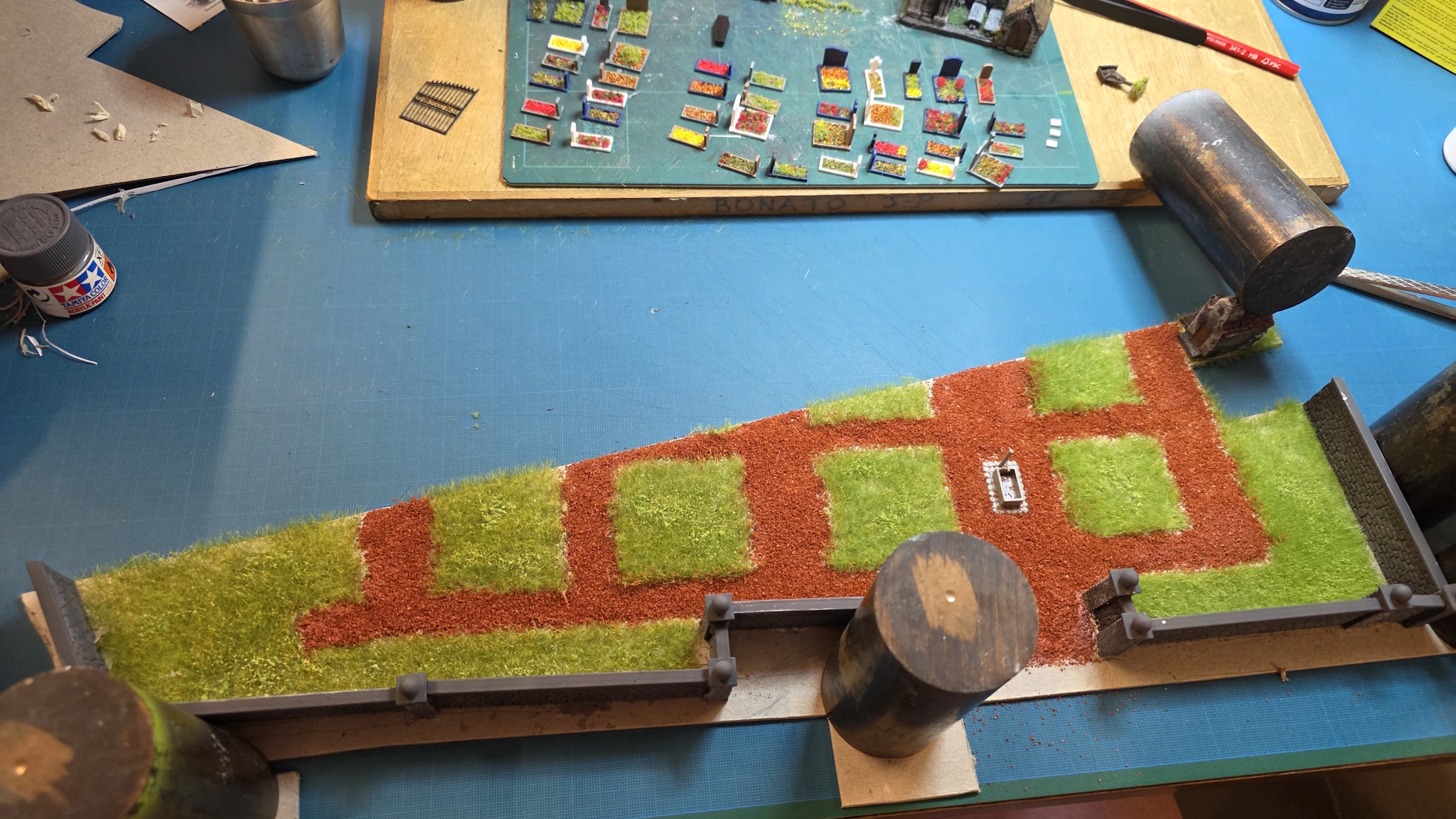 Ce la m'a pris une bonne partie de la matinée pour tous les faire Puis ensuite peinture grise pour les routes, j'attends que cela sèche avant de leur passer un petit coup de patine pour les salir un peu