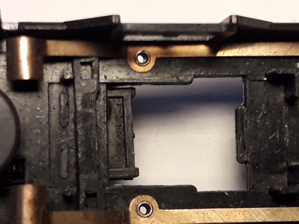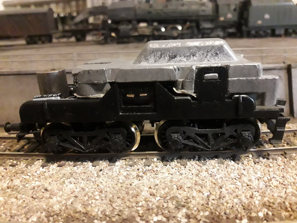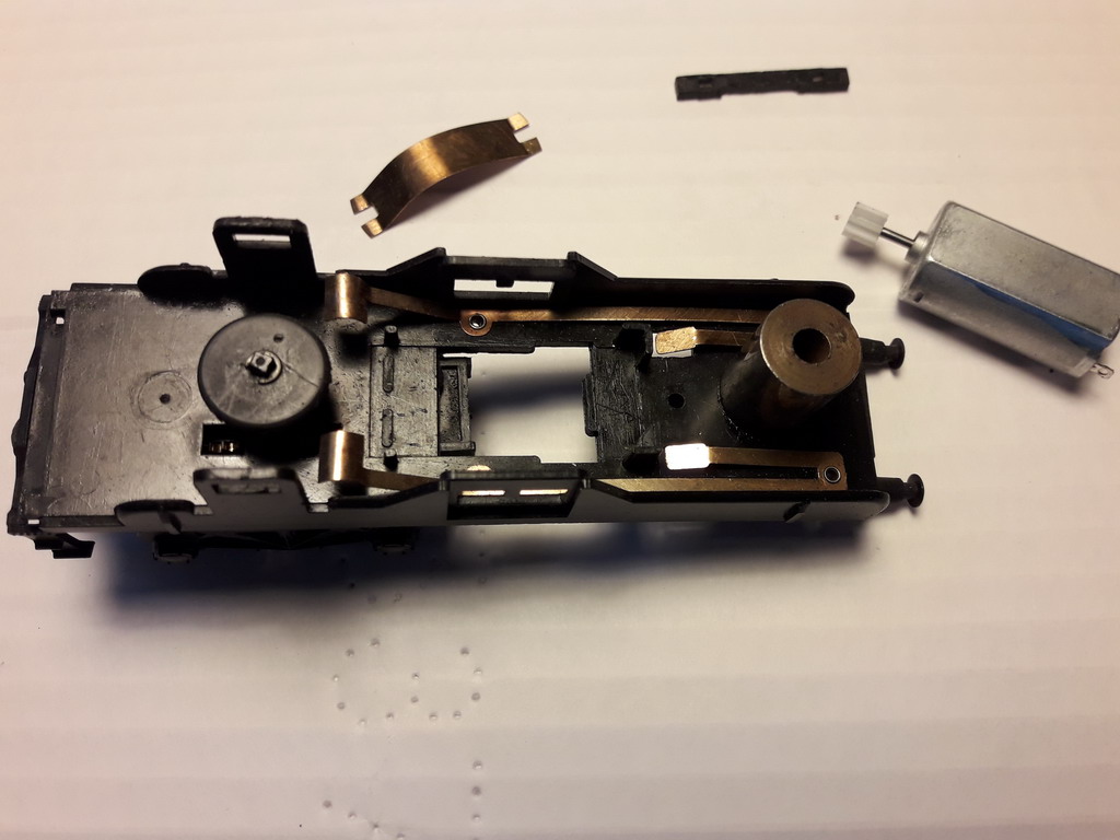 En fait, le pignon 8 dents ne donne pas un effet TGV. En courant pur le ralenti est bon. Avec le Gauge Master c'est un peu saccadé. L'amélioration de la prise de courant par la machine devra l'estomper . Les moteurs MABUCHI n'aiment pas trop le courant pulsé. J'ai donc installé dans le tender 38A moteur à plat sans modifications notoires . Un encoche dans une traverse suffit pour immobiliser latéralement le moteur et limer un peu deux bossages du lest pour dégager les contacts du moteur.