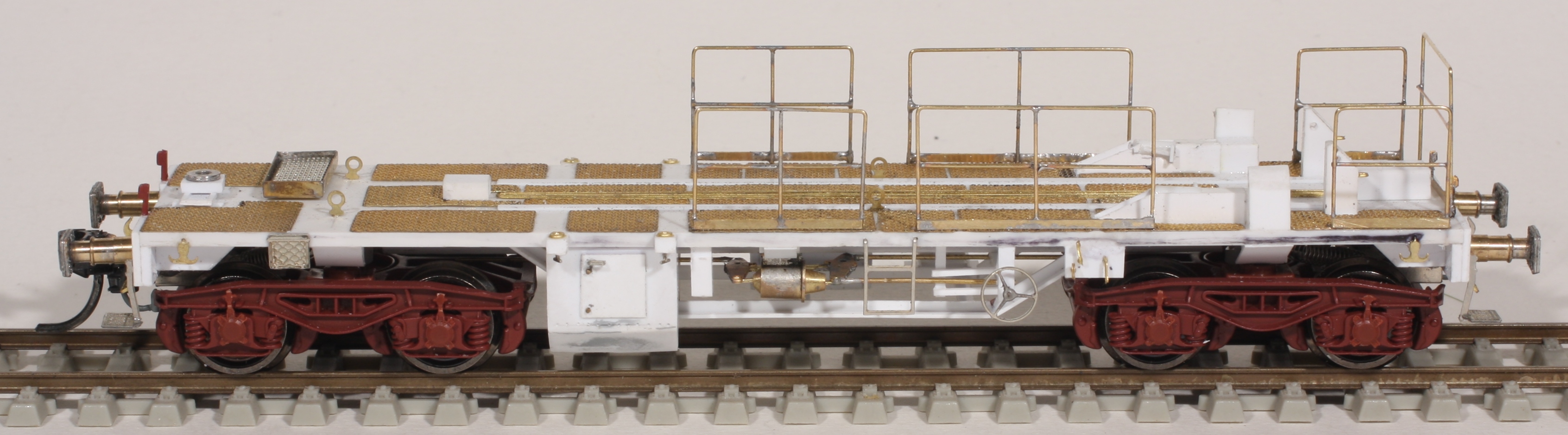 Actuellement je prépare, entre autres, les wagons les wagons d'accompagnement de la grue Kirow KRC 1210, en particulier le wagon porte-contrepoids ... à partir de plaques de plasticarte, de profilé Evergreen bogies Y25 REE et tôle antidérapante Décapod. Pratiquement du 100 % fait main car aucun wagon industriel ou artisanal ne correspond à ces modèles qui ont été fabriqués spécifiquement pour la SNCF.