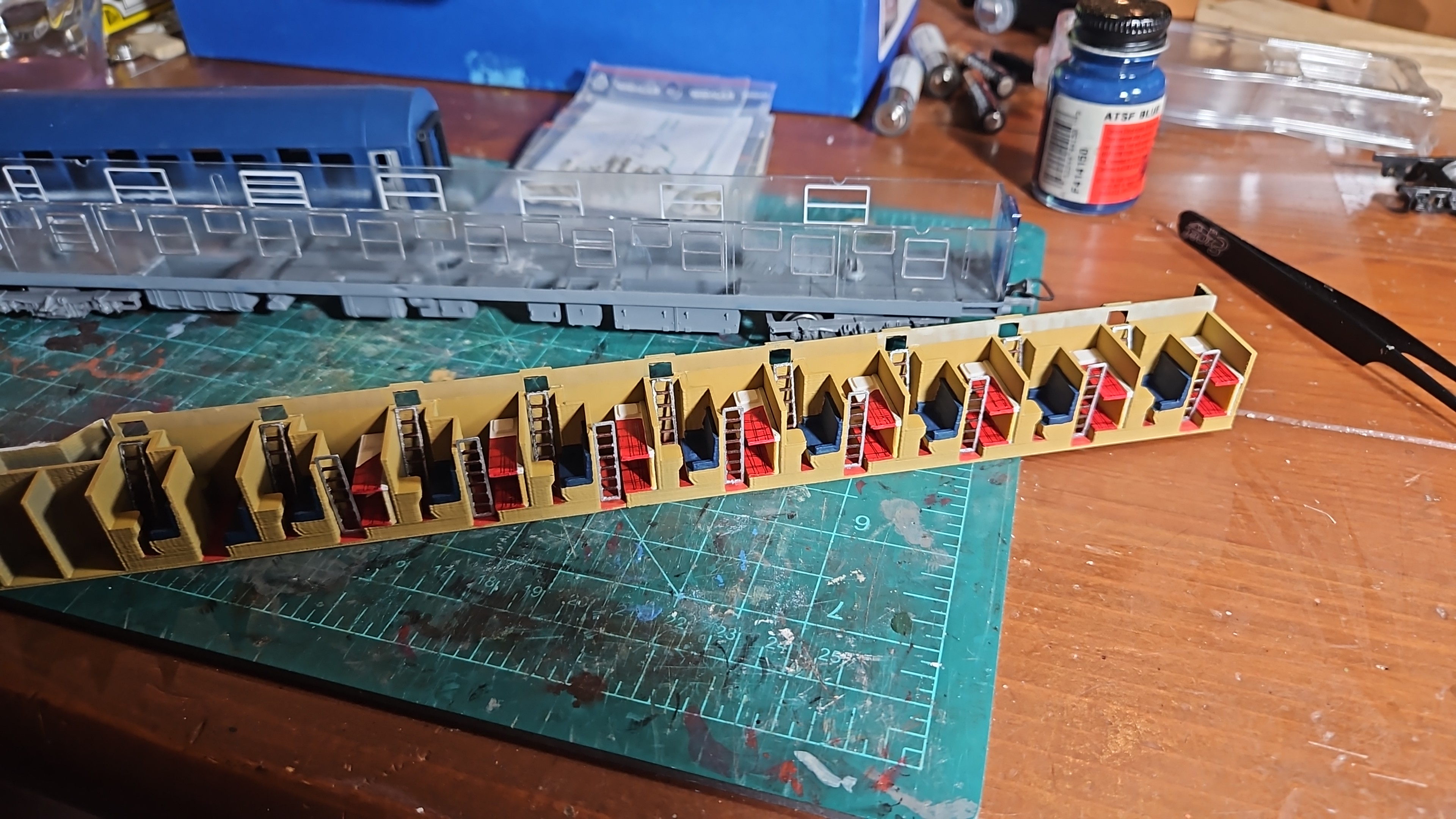 Ça avance mon affaire... Bon, la peinture n'est pas finie, mais c'est sûr qu'en limant bien les pièces imprimées, son application sera bien plus soignée que ce que j'ai fait. Bref, il faut bien choisir ses projets et leur ordre d'importance, donc ça me convient. J'en ai donc bientôt fini avec les intérieurs, youpi. En attendant, j'installe le reste des échelles pour permettre aux passagers de regagner leur lits et de faire un gros dodo.