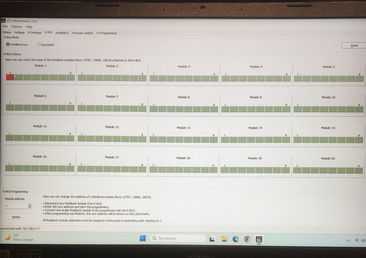On met la locomotive sous tension et la position 1 du module s'allume en rouge, la locomotive est détectée !!!