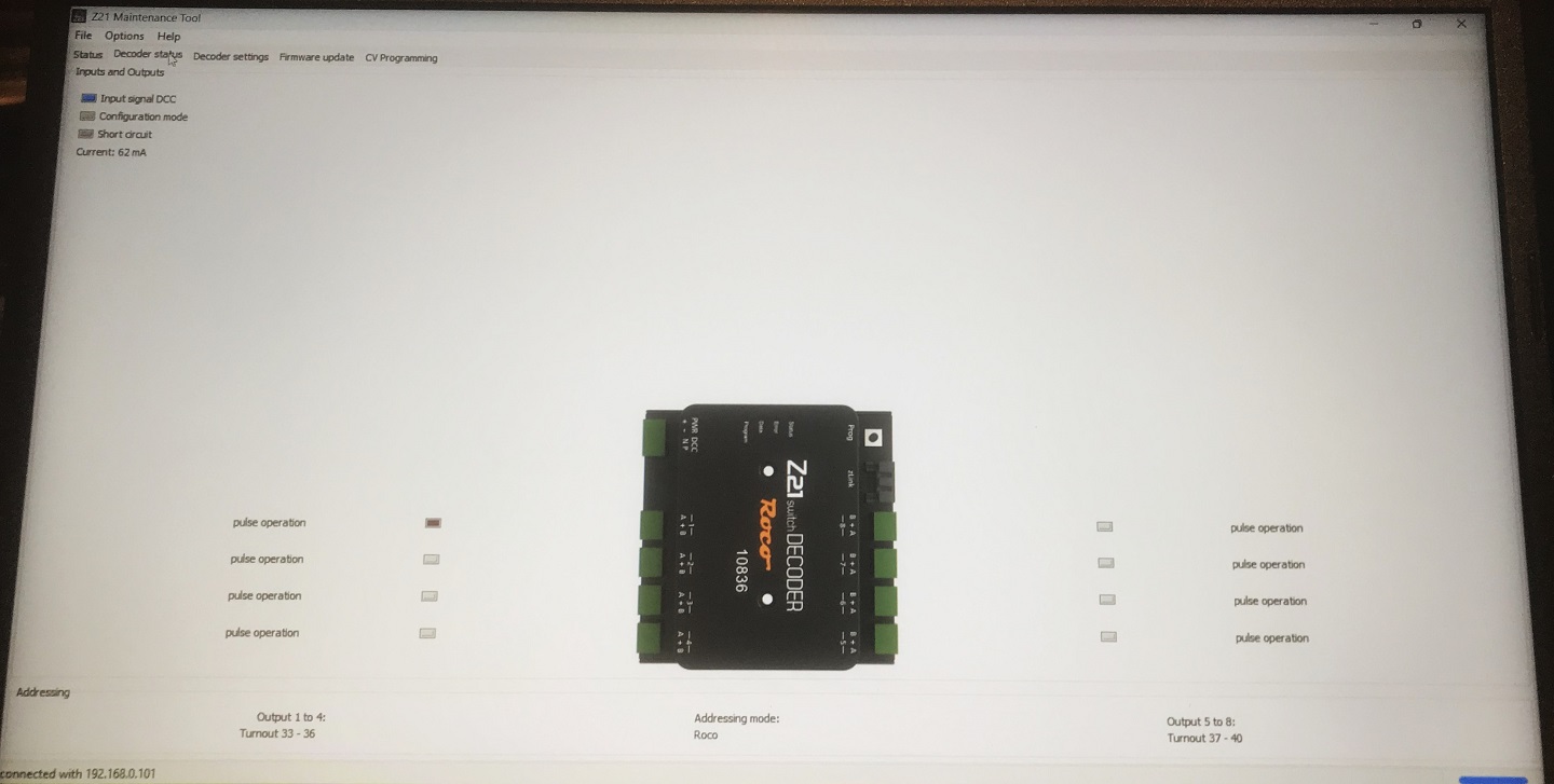 Ecran de paramétrage des aiguillages (le module peut aussi commuter des signaux mécaniques, des dételeurs, etc...)