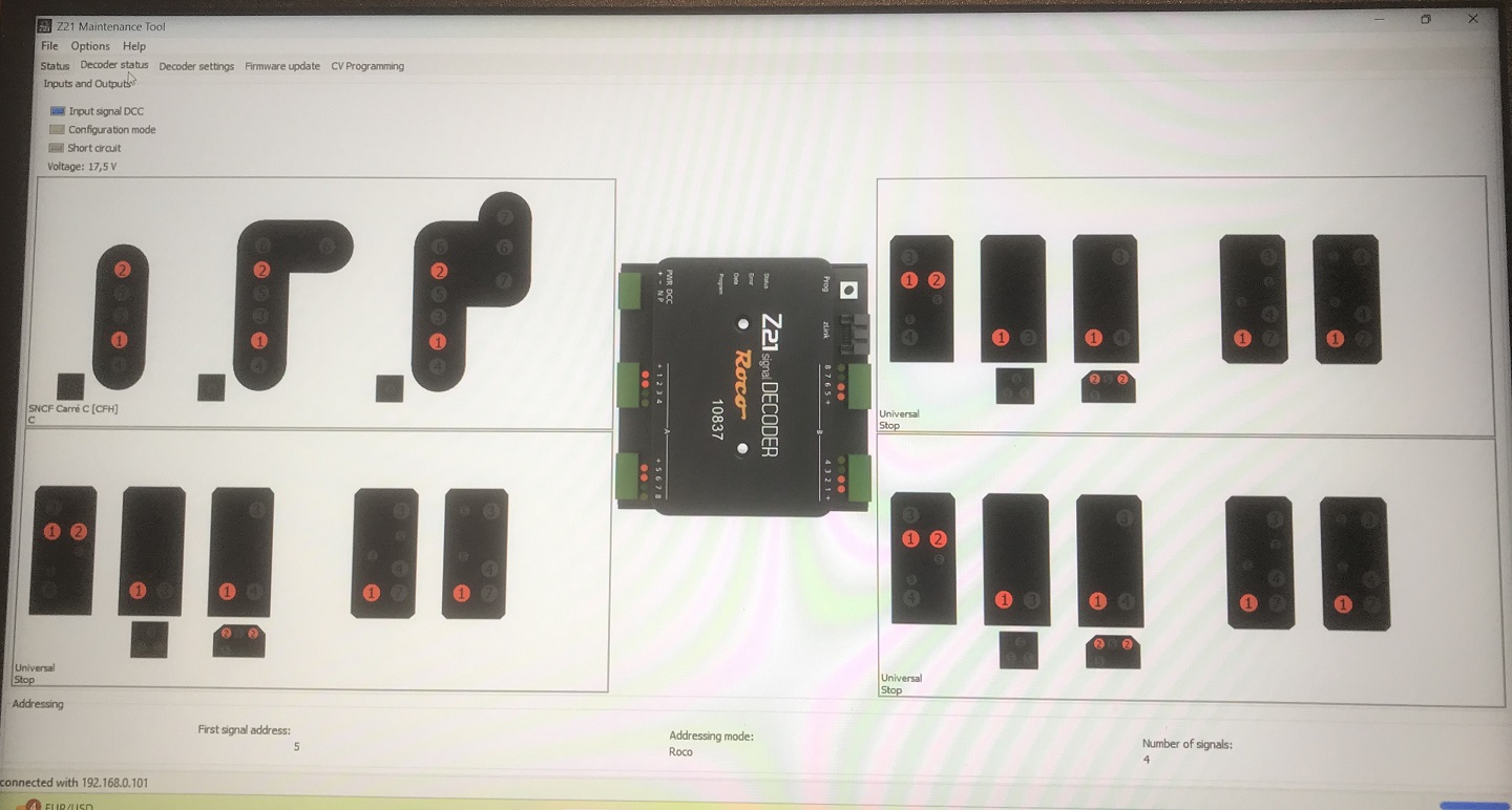 Pour les deux derniers écrans, pour avoir accès à cette interface, la présence du routeur sans fil Roco et le module Z21 Prolink sont obligatoires ! En effet, c'est le module Prolink qui gère l'interface et le logiciel de la Z21 doit pouvoir s'y connecter. Dans ce cas là, on bypasse la centrale .