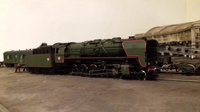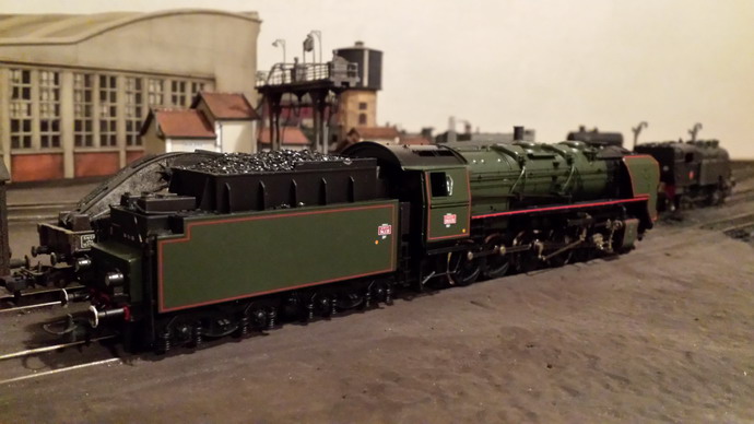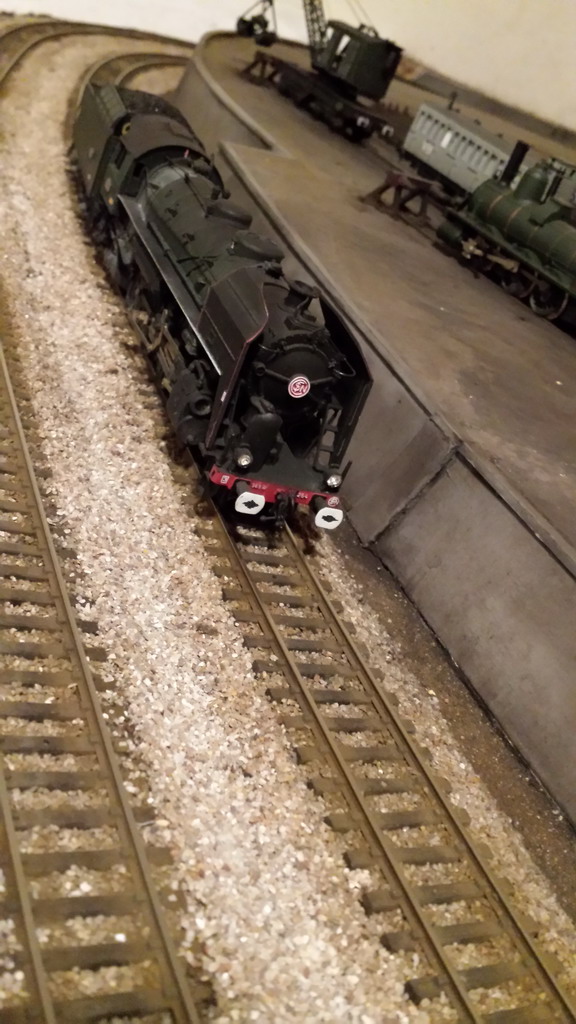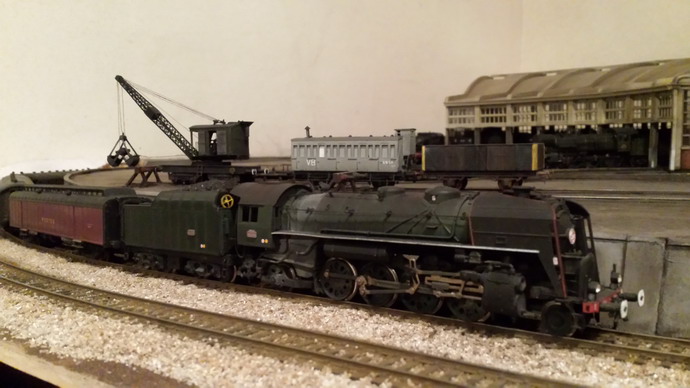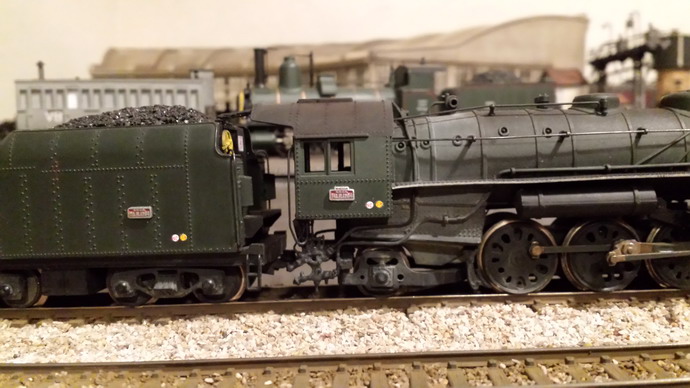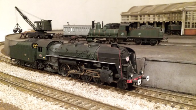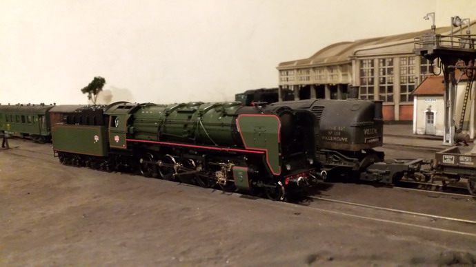 Je vais clore cet intermède avec la R Champagnole. La raison du manque d'adhérence est que les roues du tender sont équipées de bandages ROCO trop fins et en courbe; c'est la partie métallique qui est sollicitée d'où le manque d'adhérence. La suppression du lest arrière a limité le cabrage et j'ai gagné une voiture... Un passage à l'essence C améliore le comportement mais pour supprimer le patinage je dois limiter à 7/8 voitures maxi en rampe de 20. Evidement, aucun problème en plaine. De toute façon dans un premier temps, cette machine fera les patachons. Le remplacement des bandages n'est pas facile et il faudrait des bandages d'origine Jouef car ceux là "collaient" aux rails