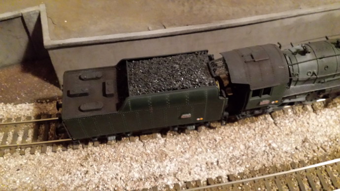 Maintenant , je la mets dans un état sortie de révision après quelques marches en service commercial. Reprise du filet de rive au tire ligne avec du vert 306, patine des bielles, noir de fumée sur la chaudière et le tender :