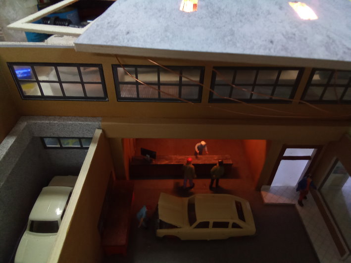 - Une concession Renault sur trois niveaux dont un est un parking sur la toiture. On y accède grâce à un monte charge hydraulique à gauche. A droite le hall d'exposition, au centre l'atelier mécanique et au fond le magasin de pièces détachées.