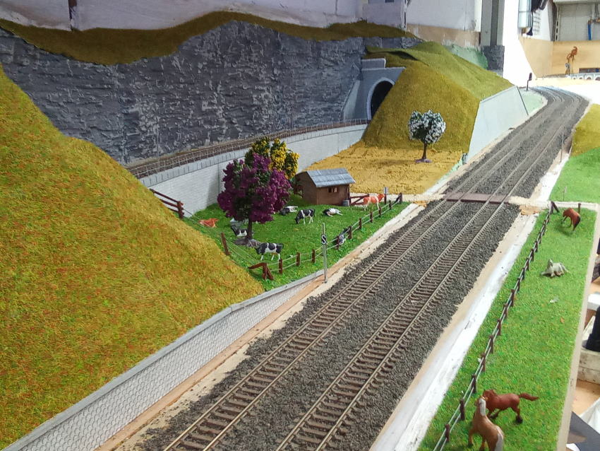 j'ai prévu de faire déboucher la voie unique dans une forêt de sapin. Le fond de décor est fait avec le traitement de texte puis imprimé sur du papier Canson avec mon imprimante A3+. J'ai commencé à les implanter. Le long de la voie j'ai implanté une guérite de chantier provenance Région et compagnie. Un chemin y mène. Je dois encore y ajouter des cantonniers.