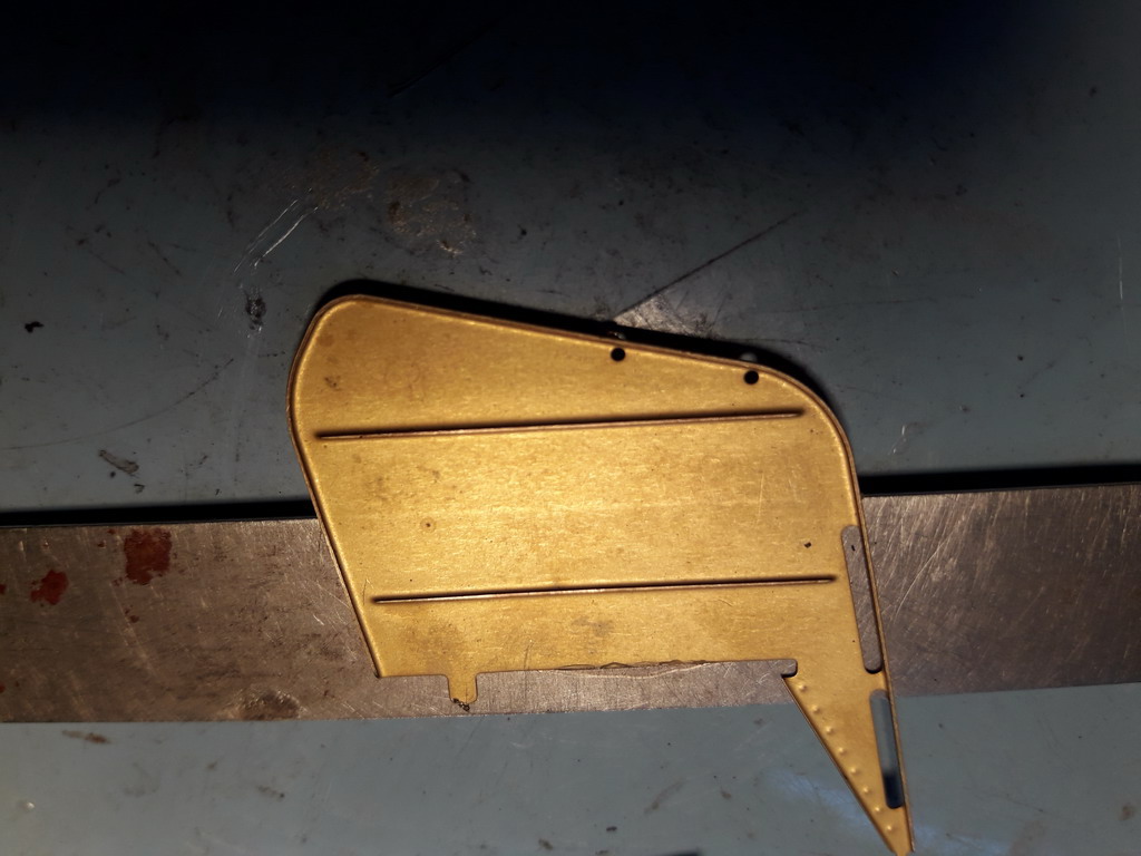 J'attaque les écrans pare-fumée MT. Traçage: sur la face verso 10mm à partir du bas pour la première pliure avec un biais de 0.8mm environ puis 19 mm à la 2ème pliure à partir du bas mais cette fois ci parallèle à l'arrête basse (parallèle au tablier)