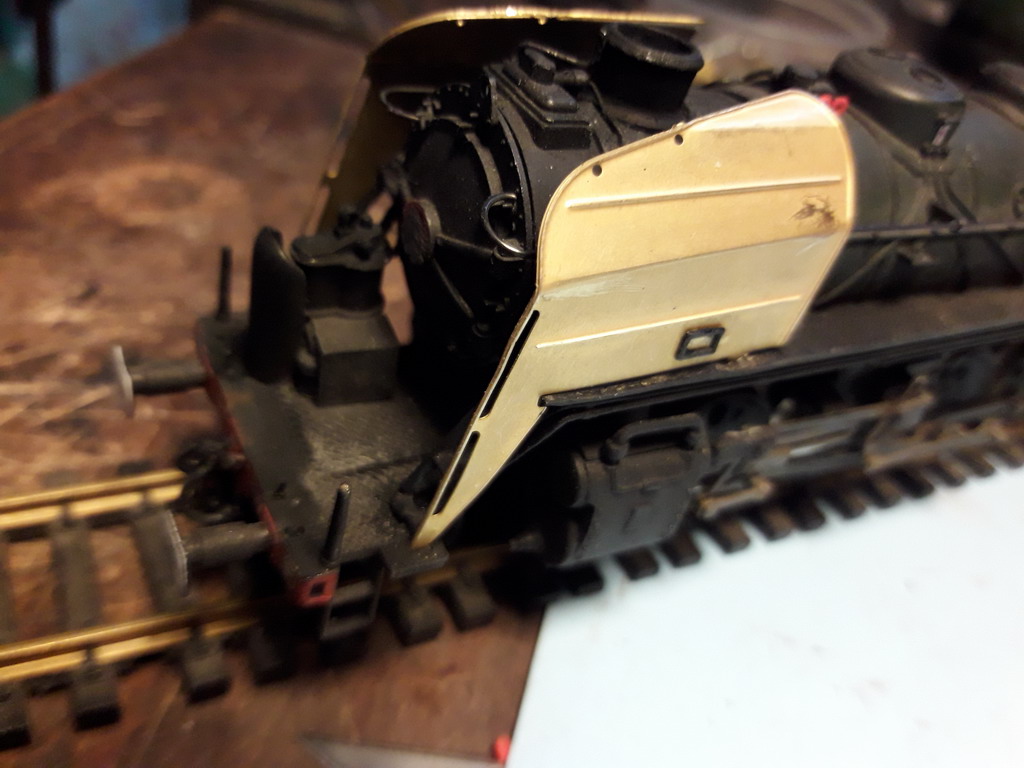 En attendant la pompe à eau chaude du réchauffeur :carre-violet: qui va remplacer celle de Jouef, je termine les écrans. Ils sont assez fragiles et il y a encore du redressage. Pour la patte dans la lumière, elle va être arrasée au raz du tablier.