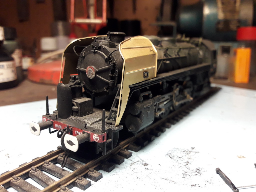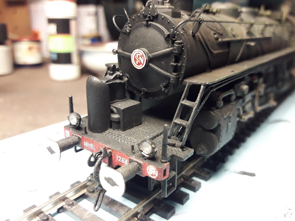 La boite à fumée est passée à la peinture (bombe Tamya S6) après masquage. Repose du macaron SNCF. Les pare-fumées ont aussi été peints mais seront montés en tout dernier, les manipulations pouvant les abimer, du détaillage restant encore à faire..