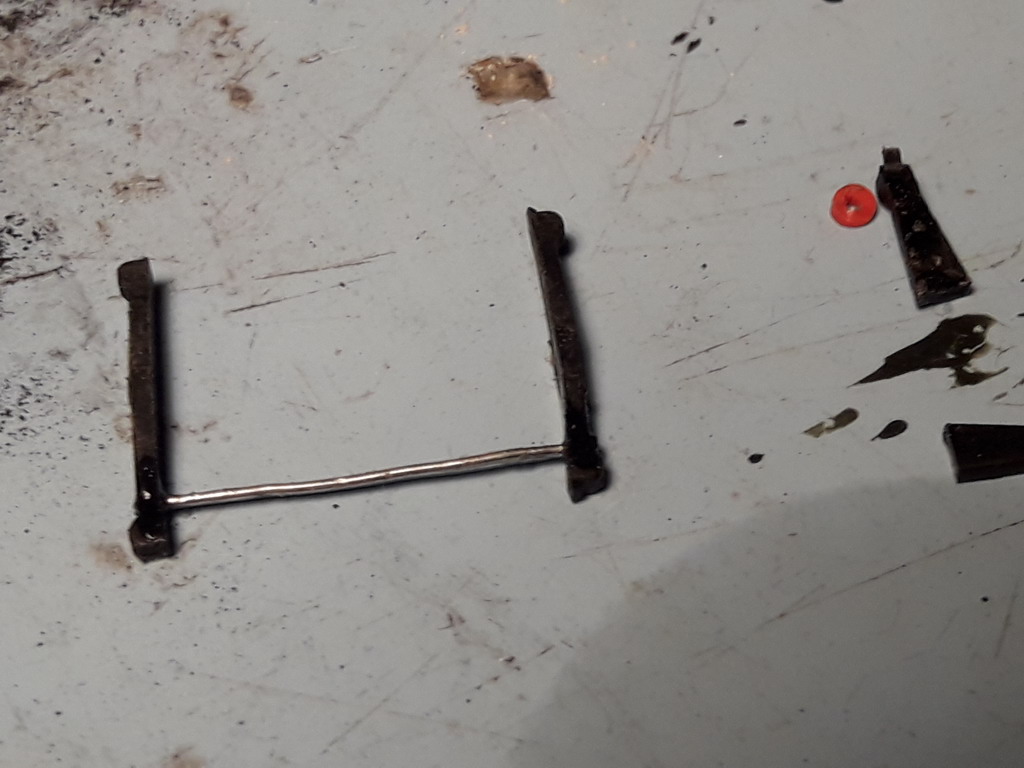 J'ai trouvé le moyen pour les pendules de sabots de frein. Perçage avec un foret de 0.5 et liaison avec une agrafe redressée et collée. La section plate et rectangulaire va me permettre de tailler au trait de scie dans une carte plastique le logement rectangulaire qui me servira de coulisse. Les pendules resteront bien verticaux.