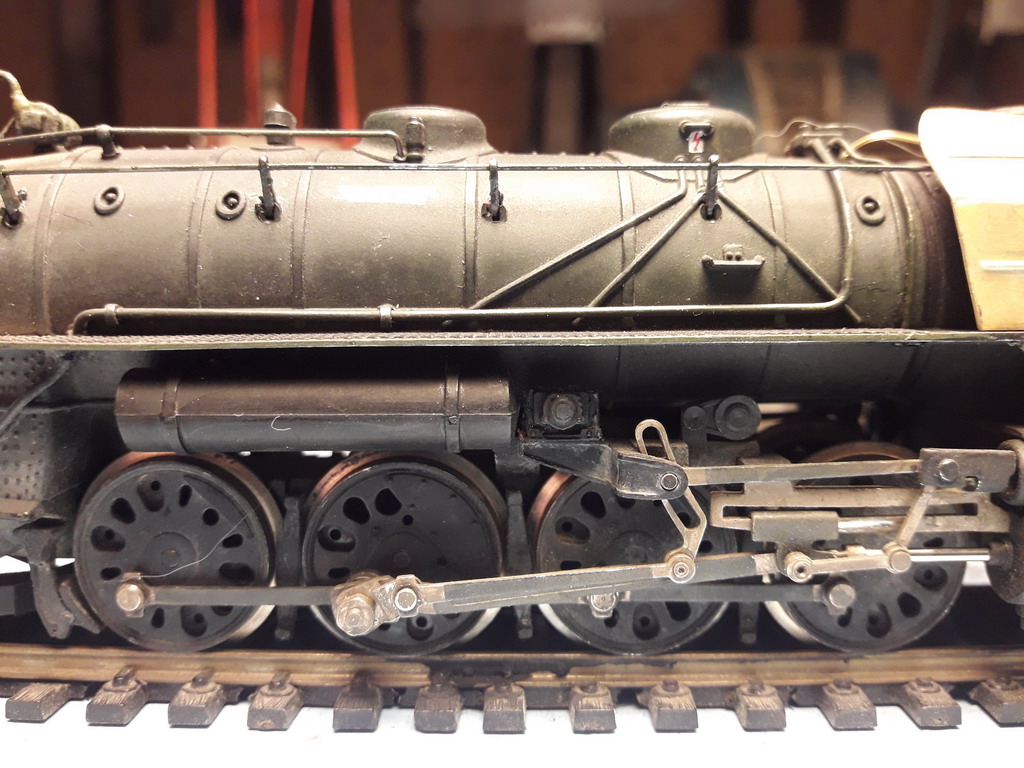 Je n'ai plus qu'à installer la pompe Worthington (que je n'ai pas encore reçue). Je vais peut être arrêter là le détaillage. Quant à la "tuyauterie", cela m'avait échappé, il s'agit d'un raidisseur fixé sur la traverse avant ( on ne voit pas l'autre masqué par la pompe à air) qui équipe uniquement les machines avec châssis en barre et bissel Coale . Là il s'agit d'une machine avec châssis moulé et bissel Delta.