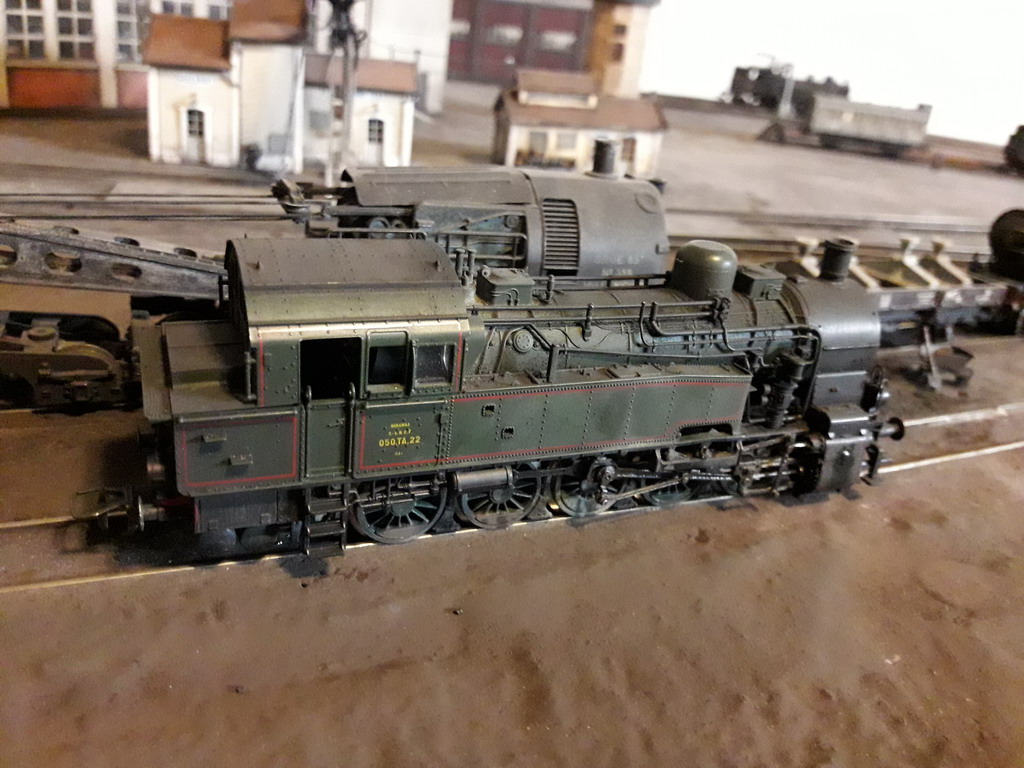 En attendant, retour sur la 050 TA22 Fleischman. C'est le modèle sans bandages d'adhérence. Suite à une réparation d'une lamelle de courant, je lui ai fait une "toilette": Poudre de pastel sec de madame appliquée au pinceau pour aquarelle (Noir, blanc et ocre jaune). Peinture du toit (Humbrol 33) est des bielles (Humbrol 33 + 145 + huile moteur