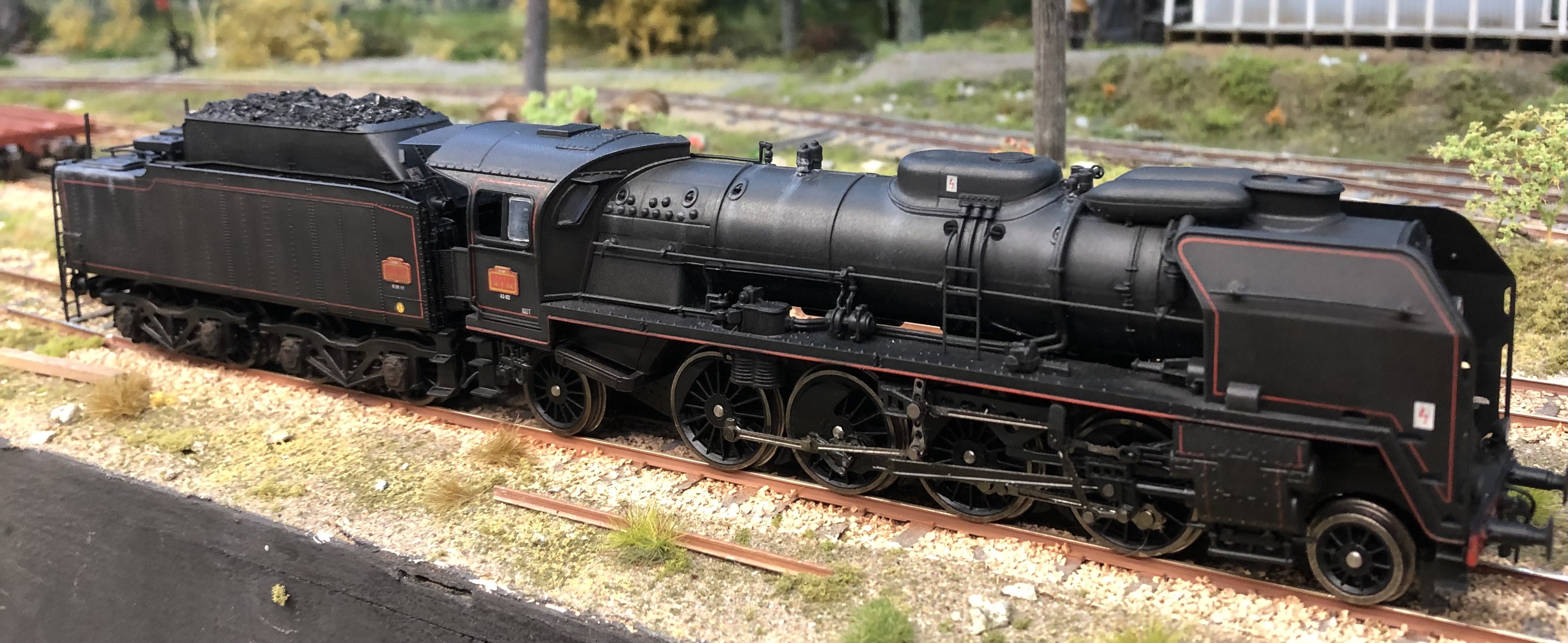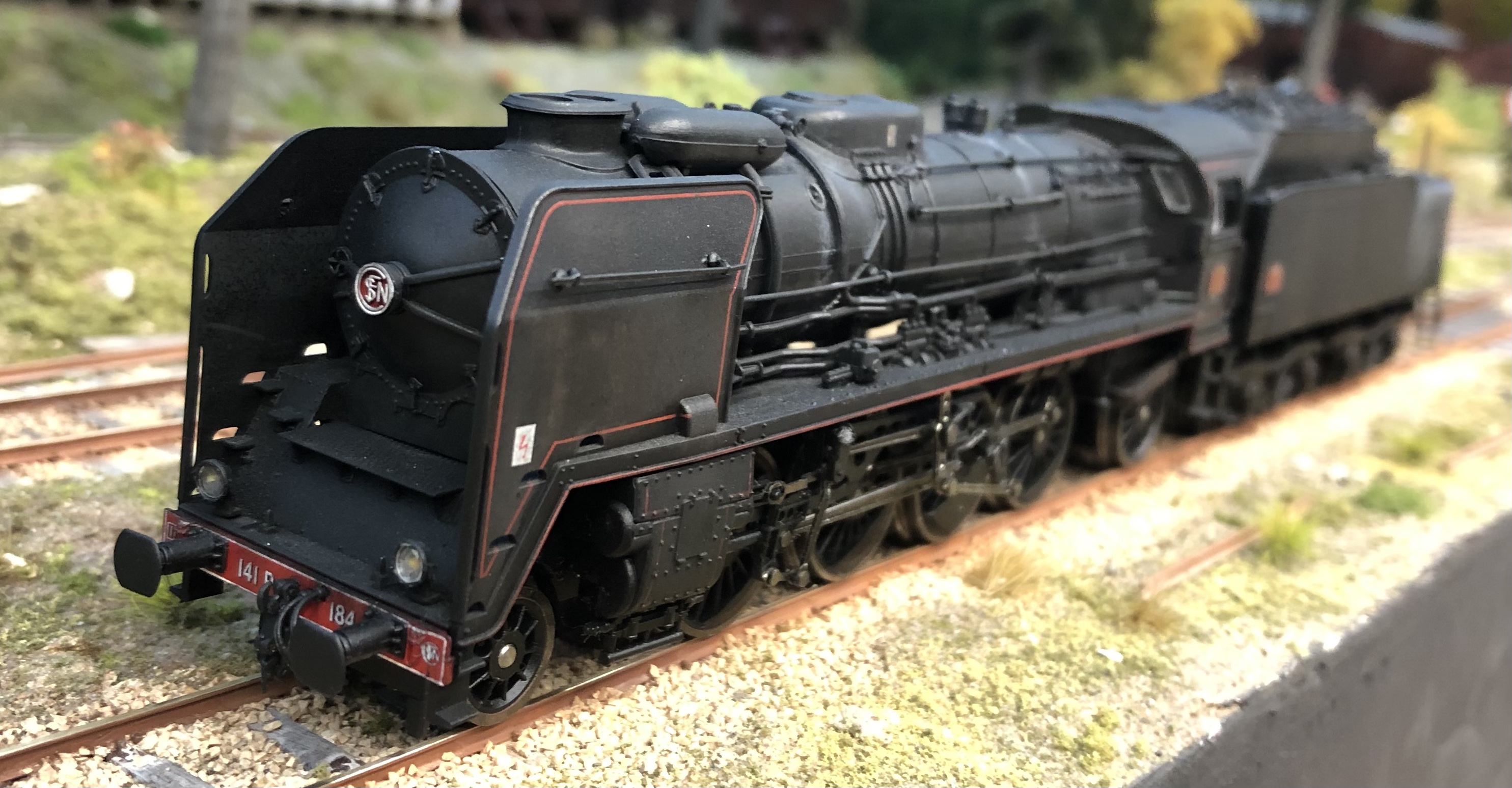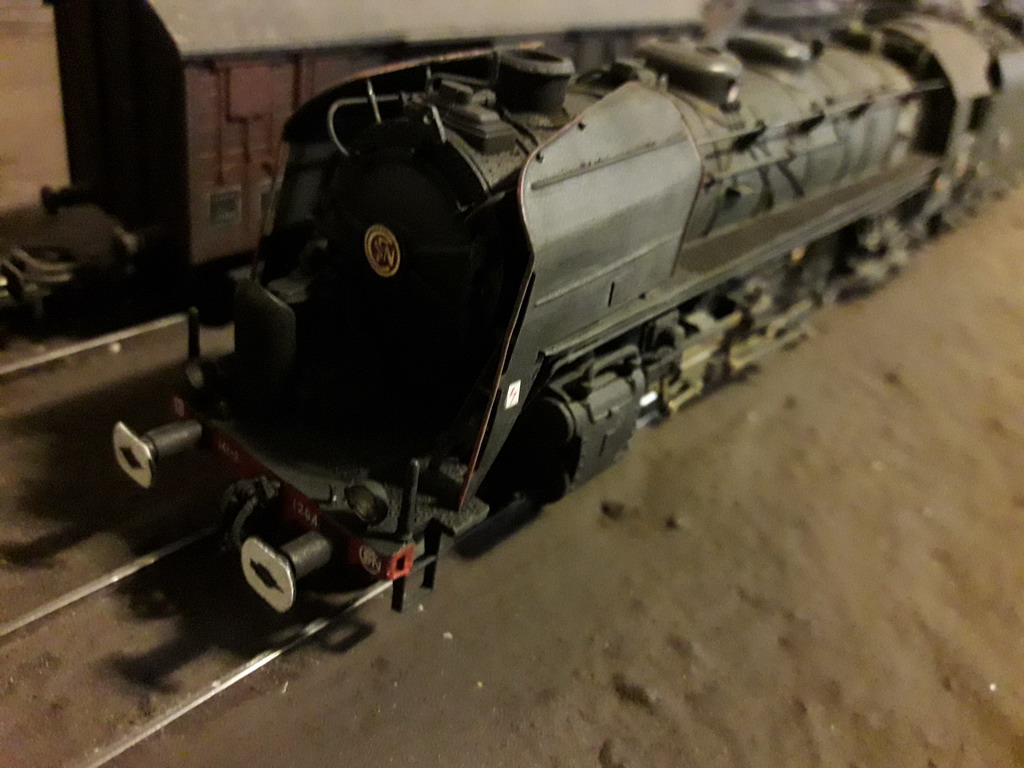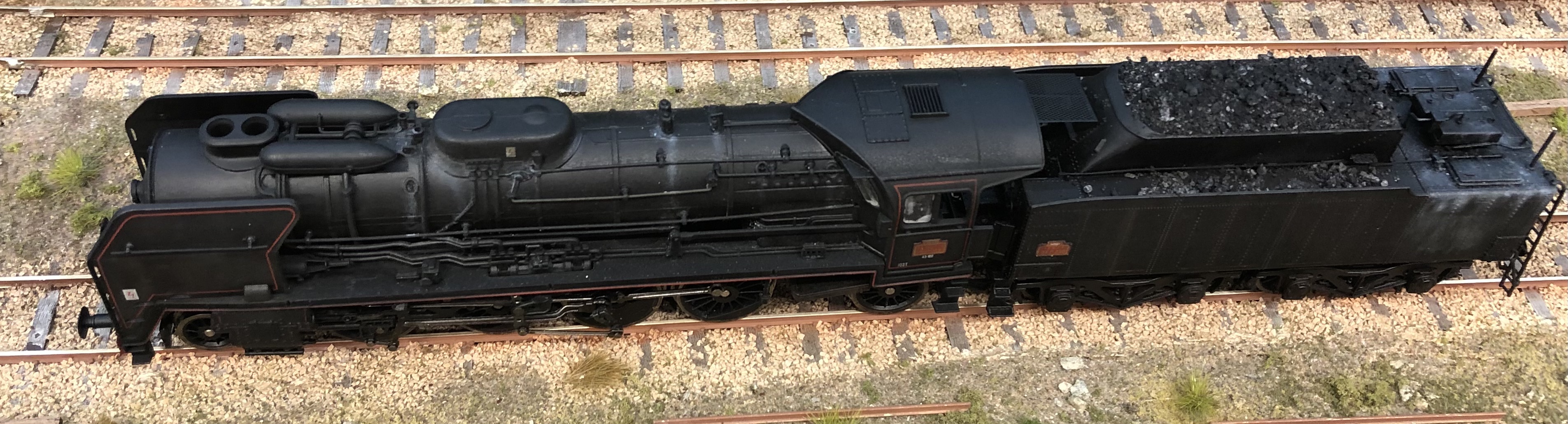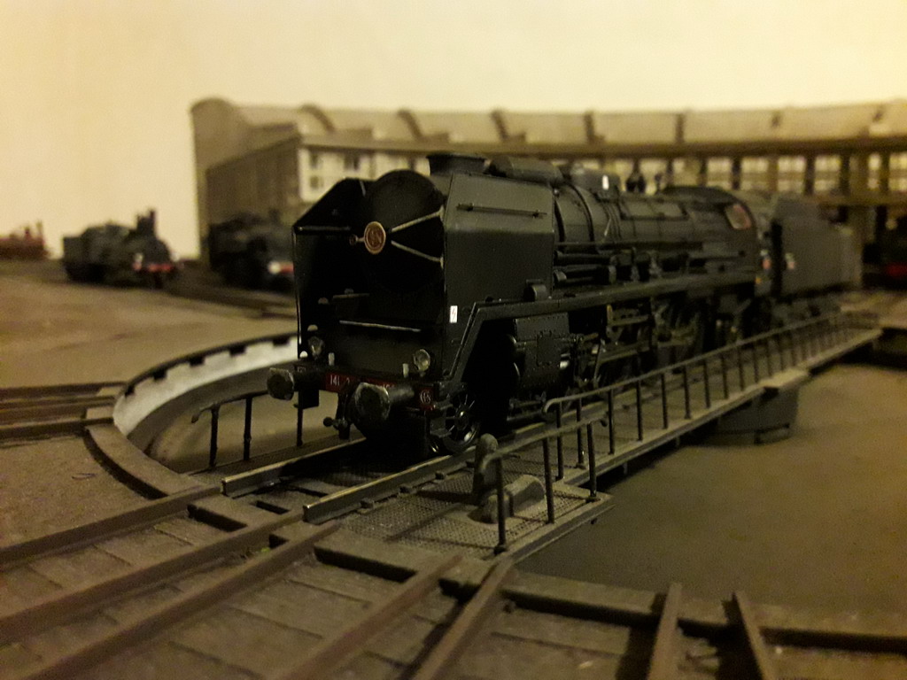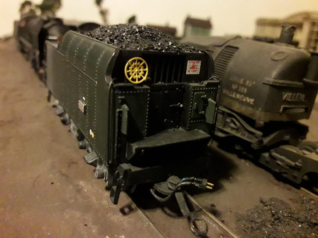 Seb a décrit plus haut sa R Jouef Collection préhistorique moi c'est antédiluvien. Ma 141R 1264 Jouef de 1969 déjà décrite plus haut remotorisée IProd' et sur un autre fil dans son état aujourd'hui plus conforme au réel (une "Suez" fuel transformée au charbon affectée au dépôt de Caen) avec quelques pièces Mécanic Train et d'autres faites maison. Cheminée Kylchap, écrans fins avec la pliure en biais ( pas parallèle au tablier), phares Marshall, nourrice de vapeur, pompe Worthington, vitrage, chandelles de frein, rambardes relevées (un coup de pince suffit) etc, arrière du tender avec poignée de manœuvre des couvercles de prise d'eau, volant de frein, suppression d'un réservoir TIA près de la hotte, échelle...La véritable plaque constructeur Montréal Locomotive Work de chez AXO est sur la première photo, offerte par un internaute ferrovipathe. Auparavant c'était un rectangle de plastique