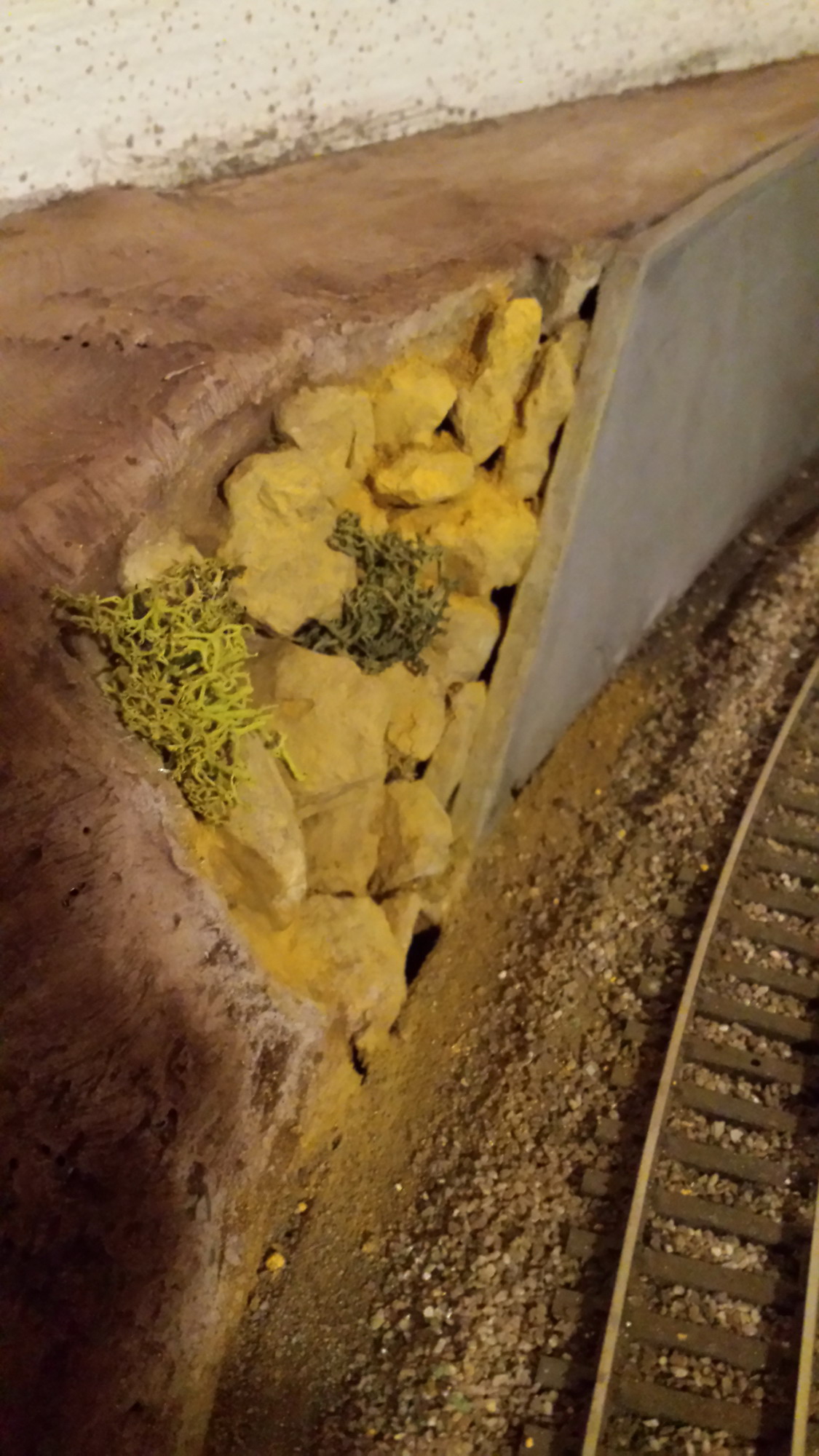 Pour l'enrochement (des cailloux de mon jardin), j'ai décapé légèrement à la brosse humide pour atténué la couche de plâtre et j'ai passé de la poudre jaune pour faire ressortir les reliefs. Il faut que cela sèche:
