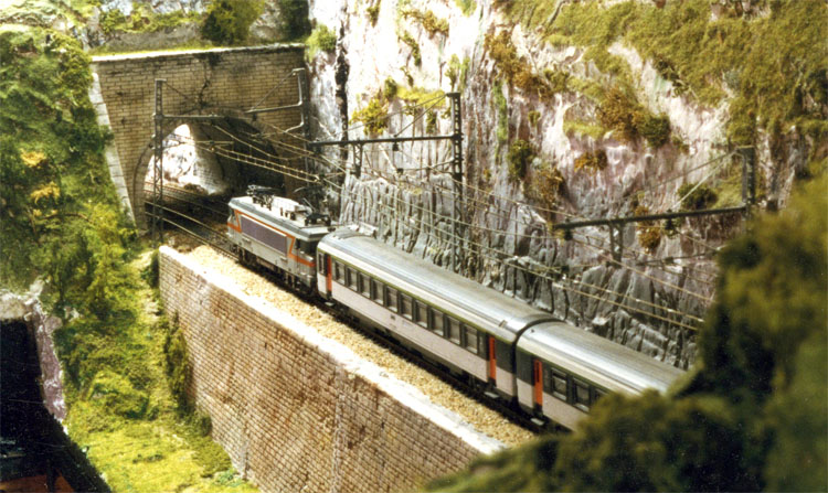 A la suite du module amovible de sortie de la gare se trouve une tranchée en courbe qui se termine par un tunnel, c'est l'endroit du réseau ou le rayon de courbe en partie visible est le plus faible: 90 cm. Ce coin n'est toujours pas fini.