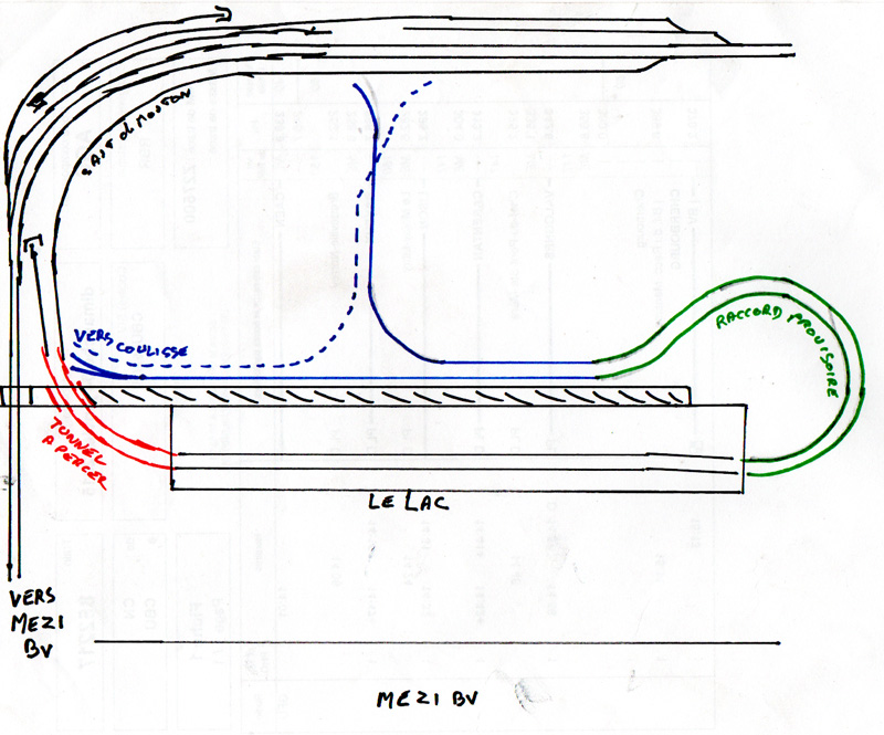 Je viens de remarquer que je n'avais pas remis de photo de la retenue d'eau (le lac comme on l'appel par chez nous), je pense à ça car pour l'instant ces trois modules ne sont pas raccordés au réseau, il faut percer un tunnel. Cela me permettra un accès provisoire à la coulisse sous le saut de mouton en confectionnant un raccord provisoire assez serré environ 60 de rayon .