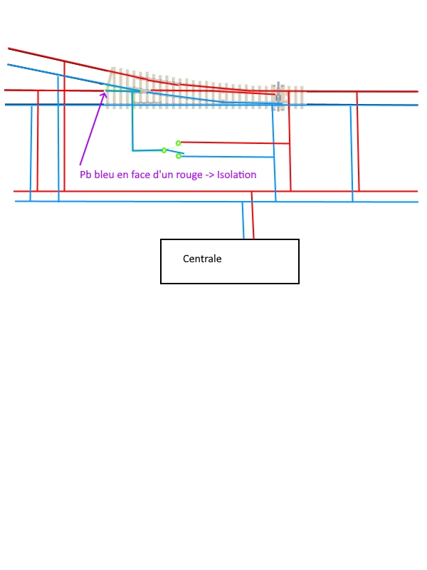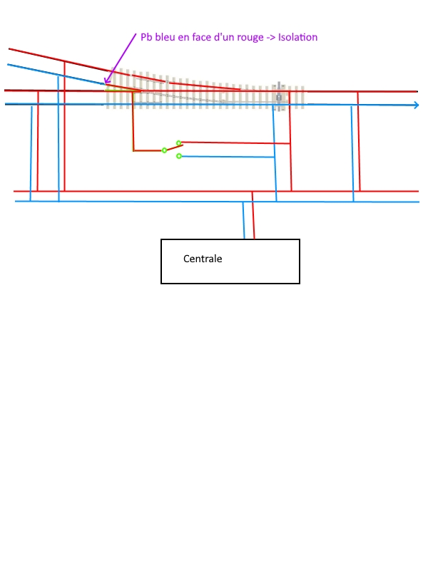 Mais si tu regardes le bout de la flèche violette tu vas t'apercevoir que le cœur à cet endroit est en lien avec un rail dont la polarité est forcément bleu puisque du au câblage => Court Circuit On s'en fou dans un sens car on veut que la motrice passe horizontalement mais en attendant cela fait disjoncter la centrale. Il va donc falloir mettre une éclisses isolante