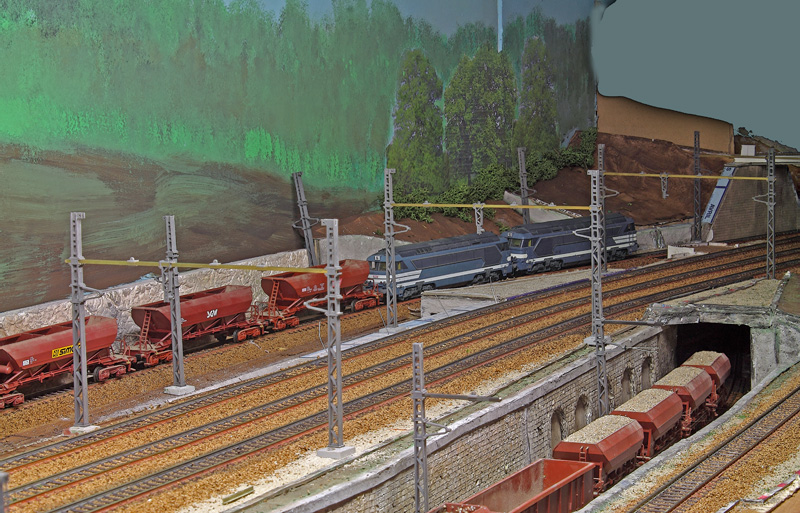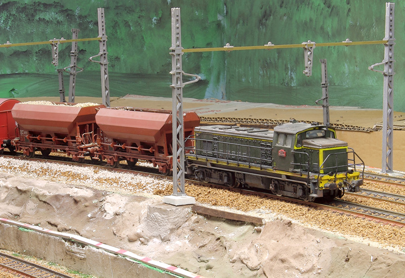 Maintenant que le problème d'affaissement et fini, la suite du ballastage des divers endroits qu'il reste et le sablage des pistes.Le sablage des piste ou leur réfection dans la réalité est d'un des pires train de travaux à faire: une pelleteuse sur des wagons plats décharge un godet de sable sur x mètres ce n'est pas elle qui roule mais le train donc arrêt mise en marche arrêt etc etc éprouvant pour le matériel et le mécano en plus c'est de nuit naturellement. Dans le genre pénible il y a aussi le lavage des isolateurs des poteaux caténaire un train de trois ou quatre citernes un wagon doté de lances haute pression et arrêt a chaque poteau toute la nuit.....!