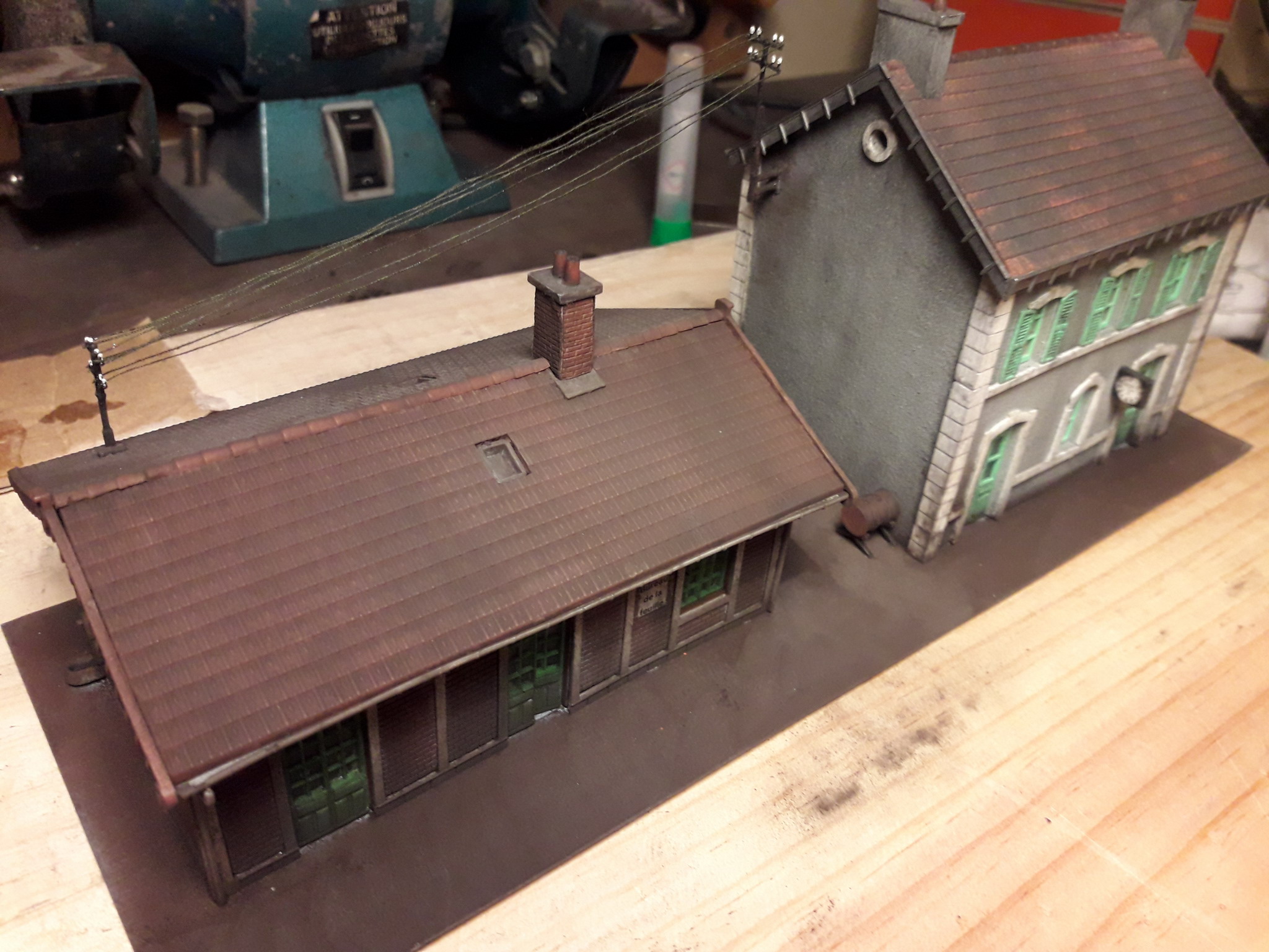 . Donc reprise de la console, recollage, peinture et un petit coup de weathering. Maintenant il n'y a plus qu'à remettre les bâtiments à leur place au dépôt. Le bâtiment de la feuille est une production MKD déjà décrite plus au haut dans ce fil. Acheté d'occase sur la baie, j'ai dû fabriquer la cheminée et refaire les inscriptions