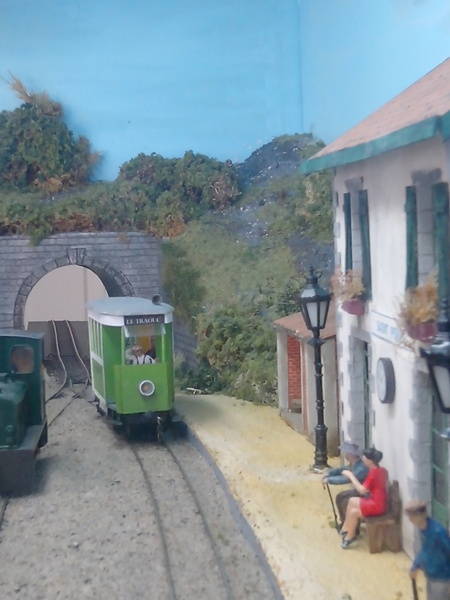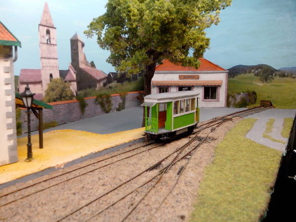 fait en 2012, les batiments et le petit tram sont fait en carton la motorisation vient d'une loco bachmann HO ,la loco est une magic train de fleischmann place au photos