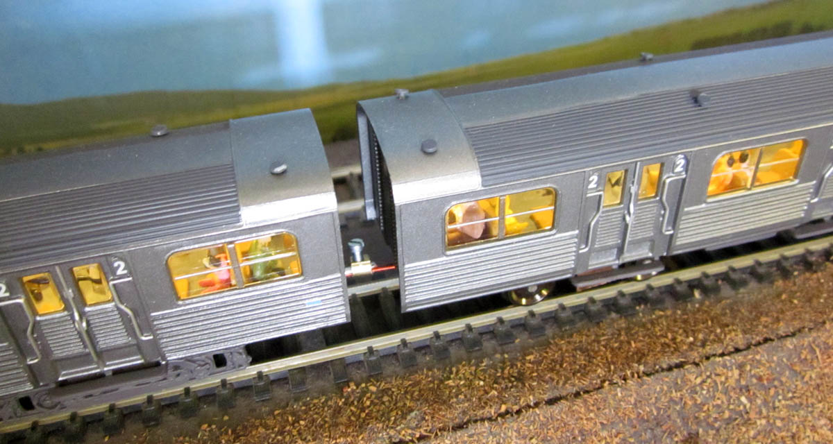 La seconde voiture est reliée électriquement à la motrice, pour améliorer la prise de courant du bogie Jouef.