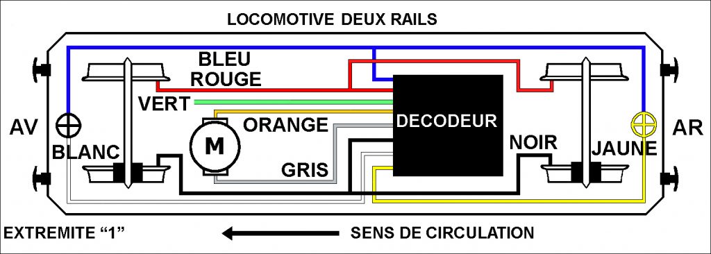 C'est le branchement "basique" d'un décodeur DCC sur vieille loco, type "Jouef canal historique" d'avant 1990