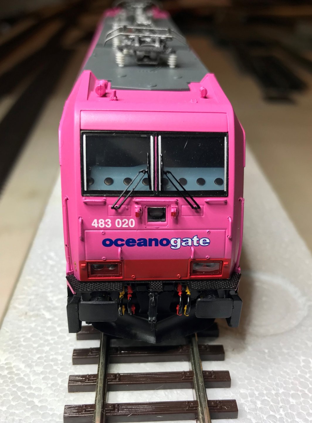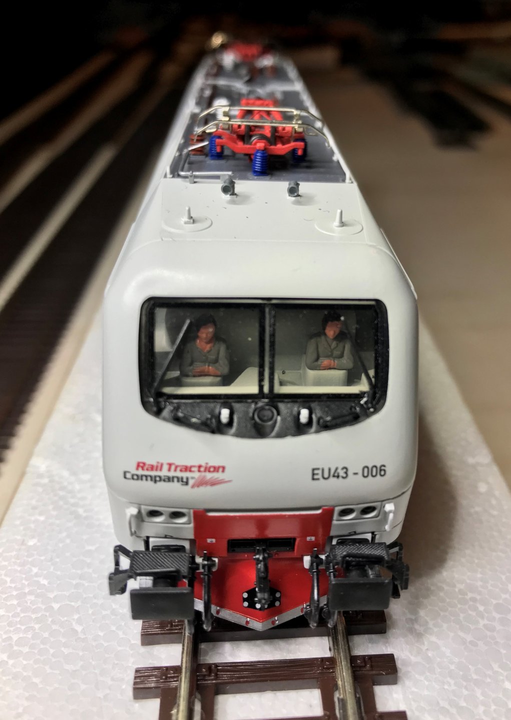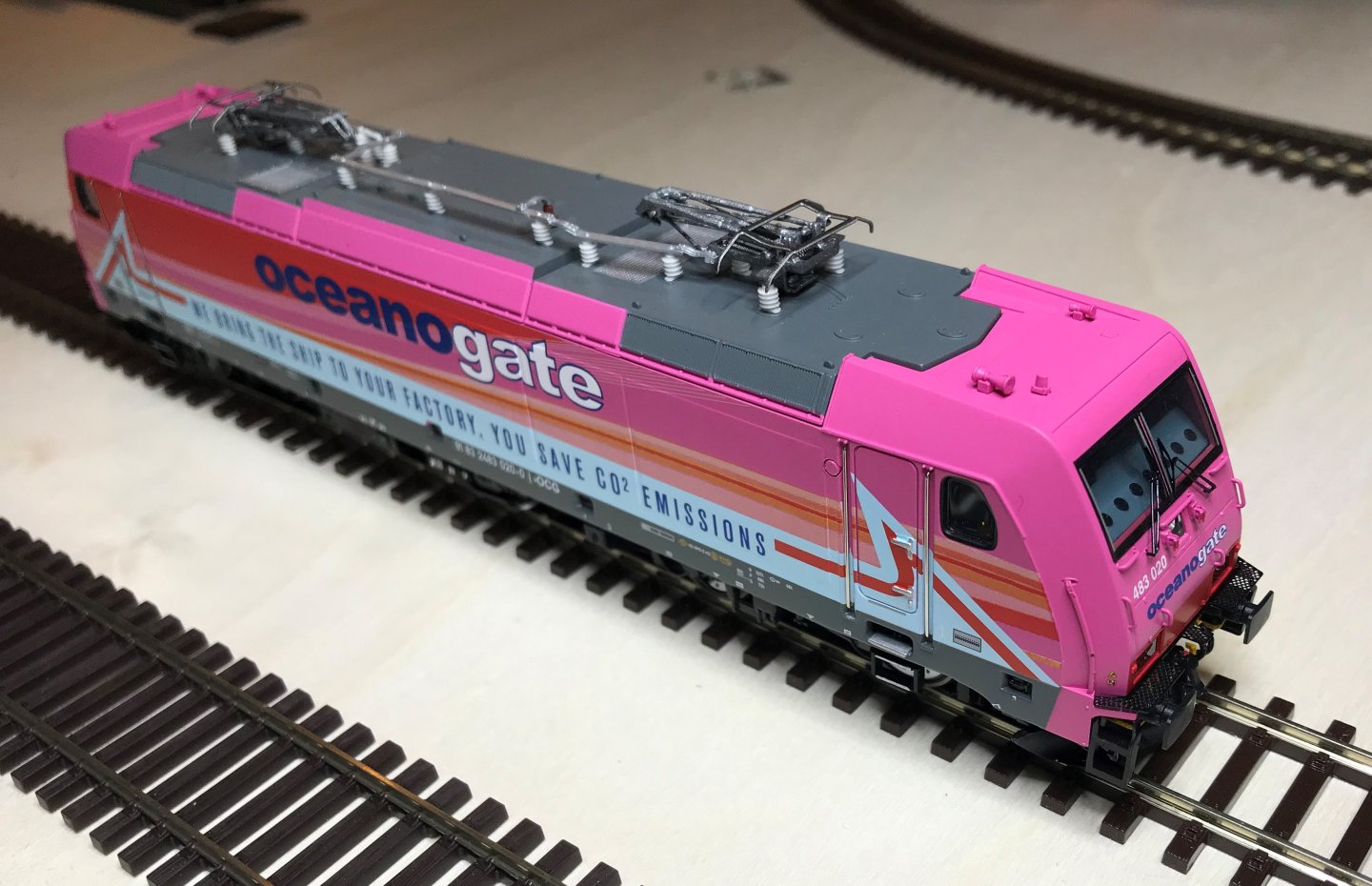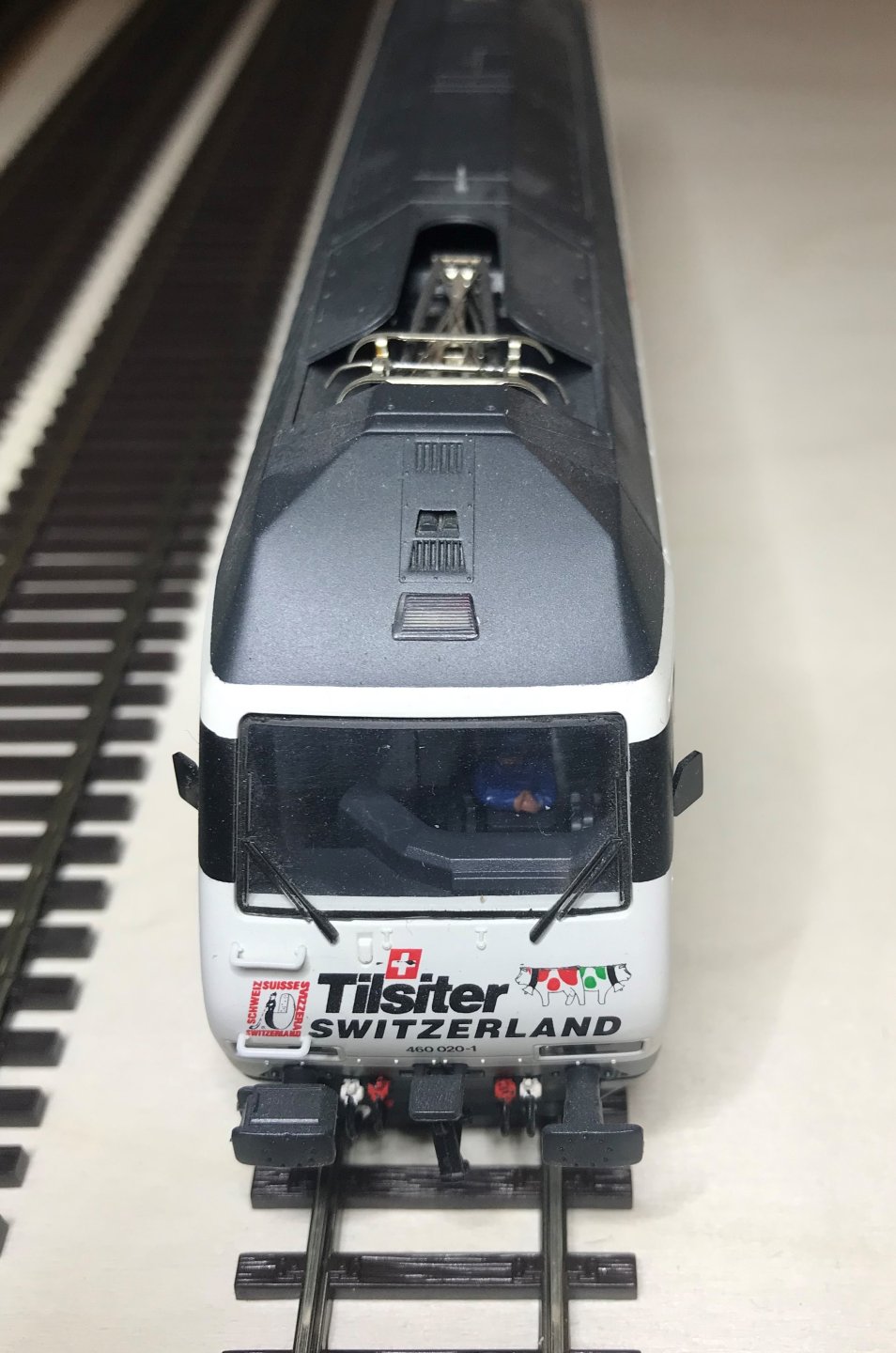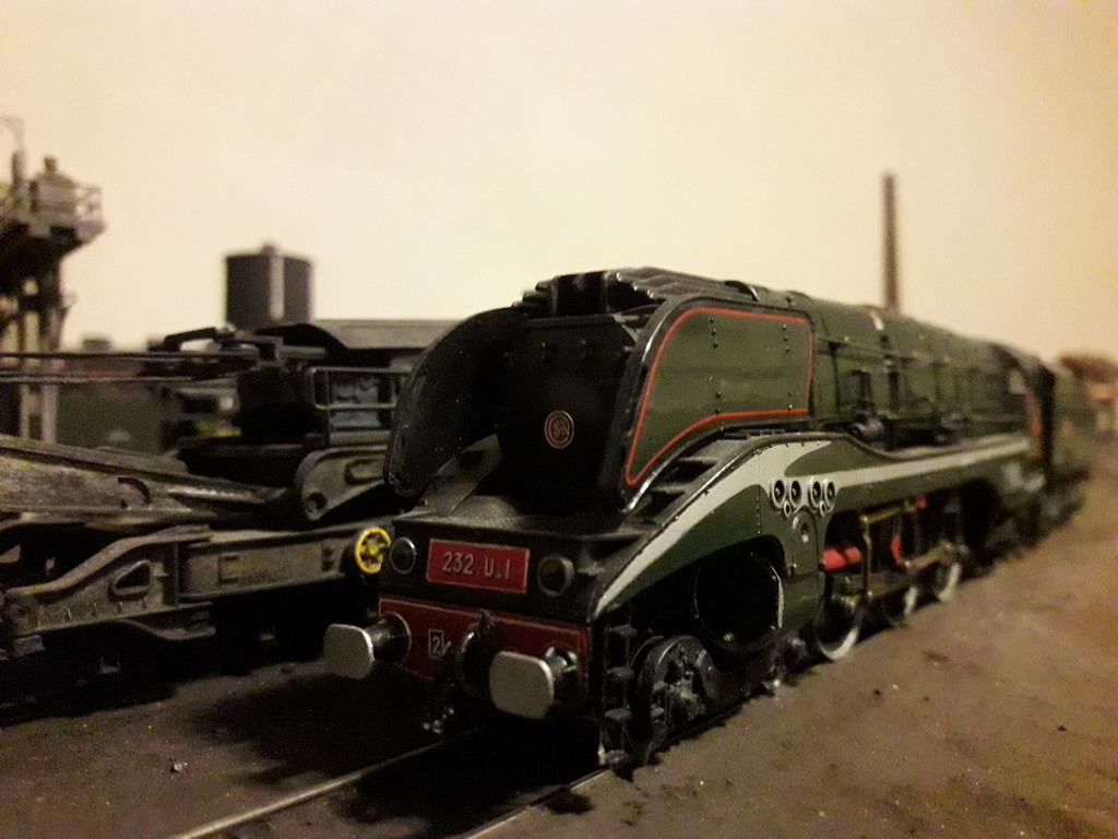 En général, elle tracte soit des citernes Total , soit un train Pullman marron crème d'origine Rivarossi.