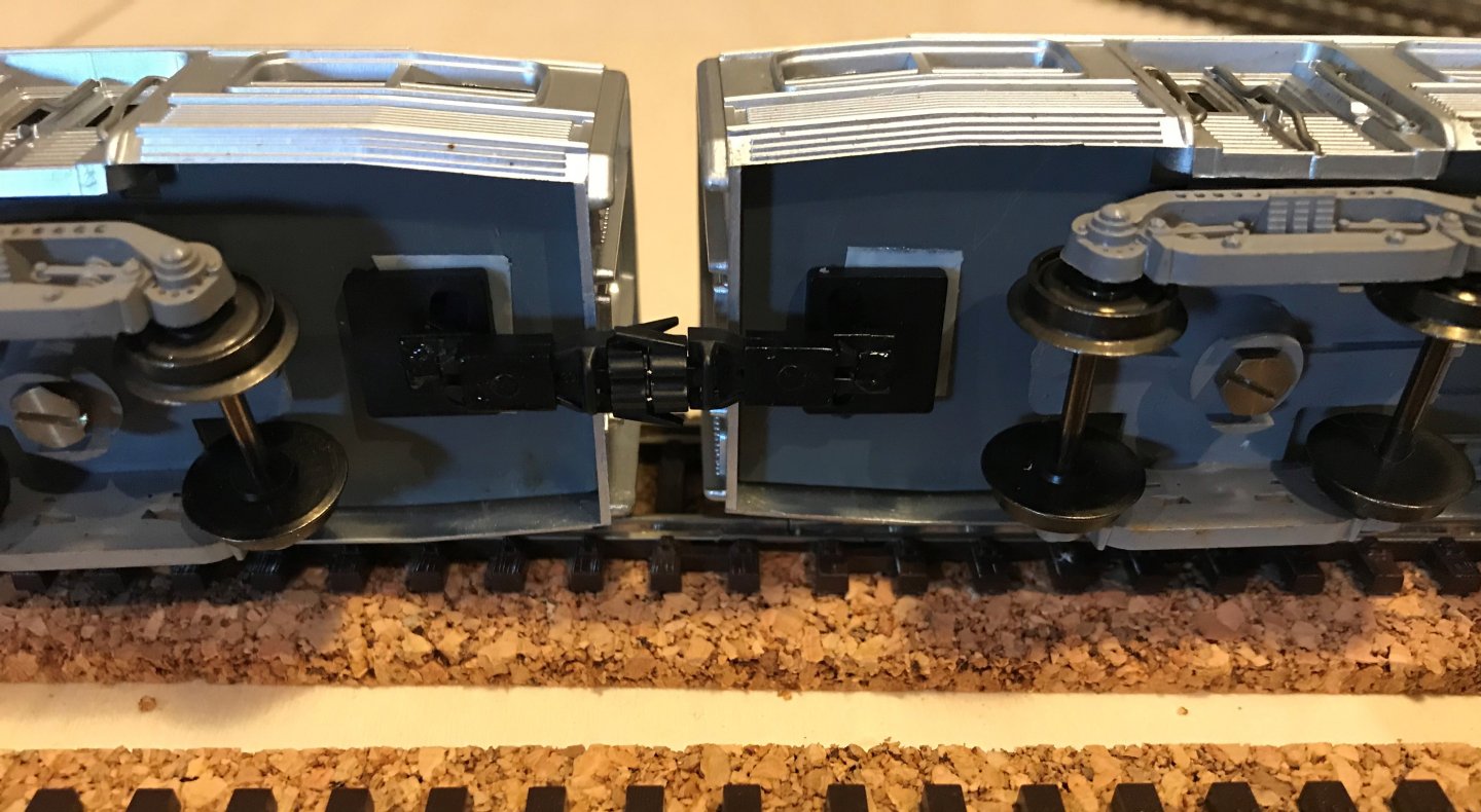 J'ai traité le problème des attelages inter-remorques et j'ai retenu la solution avec des boitiers SYMOBA et des attelages magnétiques REE. J'ai fait des tests avec du double face pour faire des essais dans différents rayons de courbure.En final, les boîtiers seront collés à l'araldite.