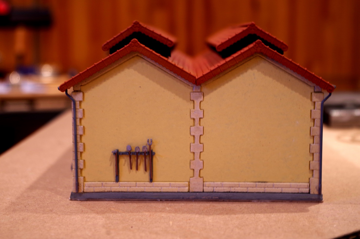 Première étape : réunir les deux murs de l’entrée, les intercalaires et les deux murs du fonds par une bande de plasticard pour les rigidifier. Assembler tous les murs et intercalaires. Mise en peinture (Humbrol) en mélangeant les teintes pour obtenir la couleur souhaitée. Peindre l’intérieur, en gris.