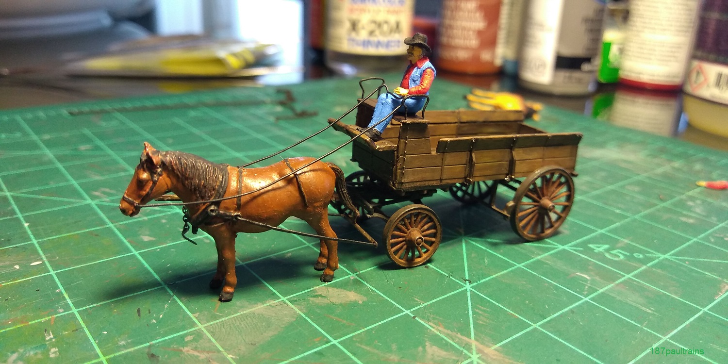 Bon, les sabots sont rabotés donc un peu moins épais. J'ai fabriqué le reste du système de freinage pour que ça ait l'air crédible à partir de petites retailles en bois. J'ai également commencé à assembler le fermier et peint ses vêtements. Il y avait beaucoup de matériel à ébarber mais une fois cette longue et minutieuse étape terminée, le petit monsieur est assez réaliste. Ça donne ça :