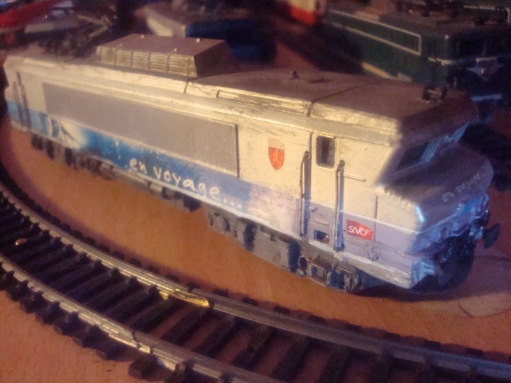 Bonjour à tous .... petits bricolages , le TGV 531 Mehano devenu la rame 325 Atlantique du record du monde 515.3 Km/h , déclaques maison avec l'ordi . Une BB22200 Nord Pas de Calais ex 7200 Lima , décalques maison aussi , et une 15000 ' en voyage ' là les décalques ont été trouvées sur le site d'enchère que nous connaissons tous ....