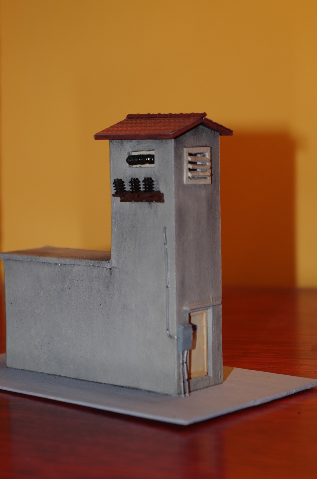 Le bâtiment est en carton de calendrier bancaire de 2 mm d'épaisseur. Les portes, les ailettes de l'aérateur et les supports des isolateurs horizontaux sont en carte plastique de 1mm. Les entourages des portes sont en profilés Evergreen réf 110 et 132. Les platines supportant les isolateurs verticaux sont des profilés H d'Evergreen je n'ai pas la référence. Le toit est en carton de 1,5mm d'épaisseur sur lequel j'ai fixé des tuiles Redutex réf R087TF113, les tuiles faîtières de marque Décapod réf 5962. Les isolateurs récupérés d'un stock ancien. Les câbles électriques d'un diamètre de 1,5mm.