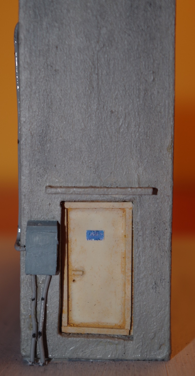 Les peintures : un apprêt du bâtiment est réalisé à l'aide d'une bombe couleur galet (gris clair) de chez AMT ; ensuite un mélange de peintures acrylique blanc, noir, ocre. Les portes sont peintes en Humbrol beige mat 121 pour l'une et gris mat 145 pour l'autre. Les traces de rouille sont un jus de pastel sec orangé. Les salissures des murs et toit poudre de fusain passée à sec à la brosse.