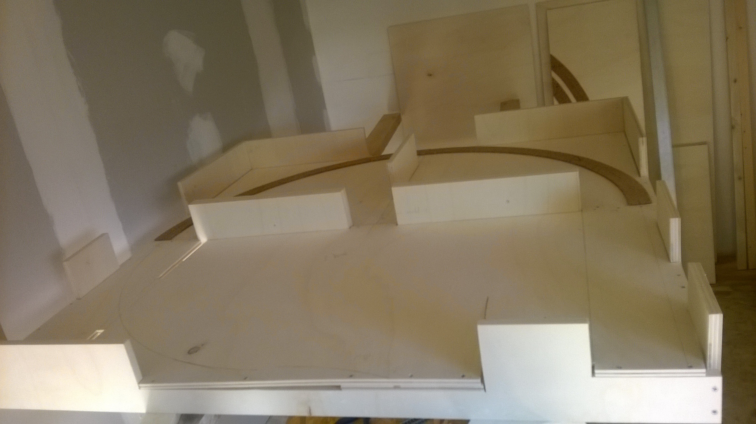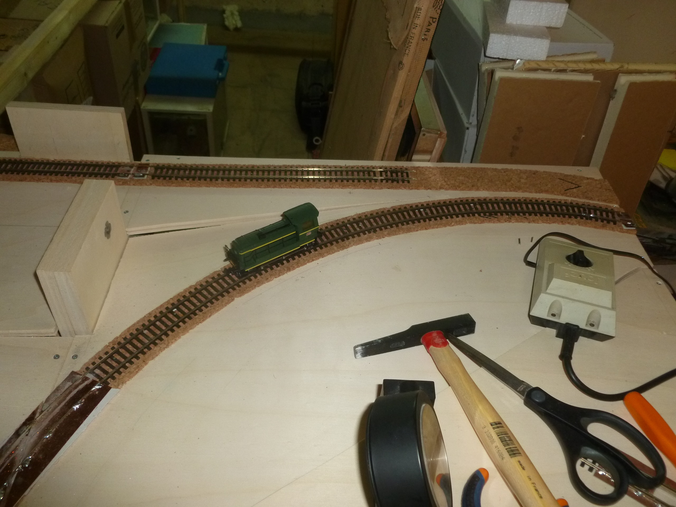Les voies de la partie supérieure sont fixées sur un panneau mobile qui peut être retiré. Cela permet ainsi de pouvoir poser les voies du niveau inférieur. Avec cette méthode je peux faire rouler des trains en attendant la modification du réseau.