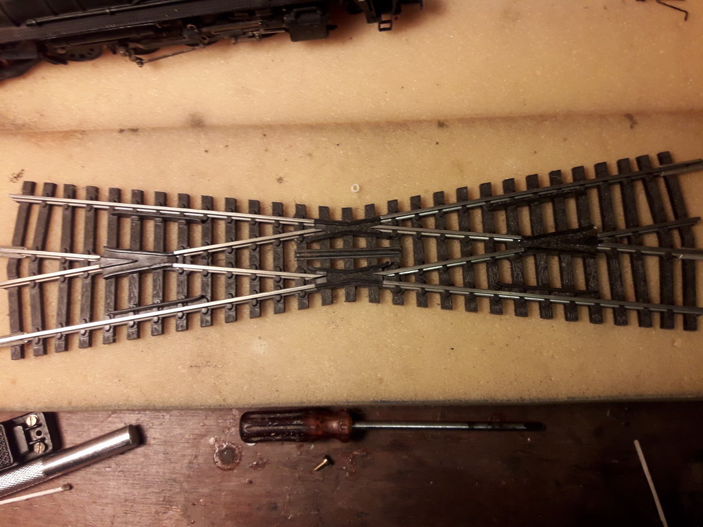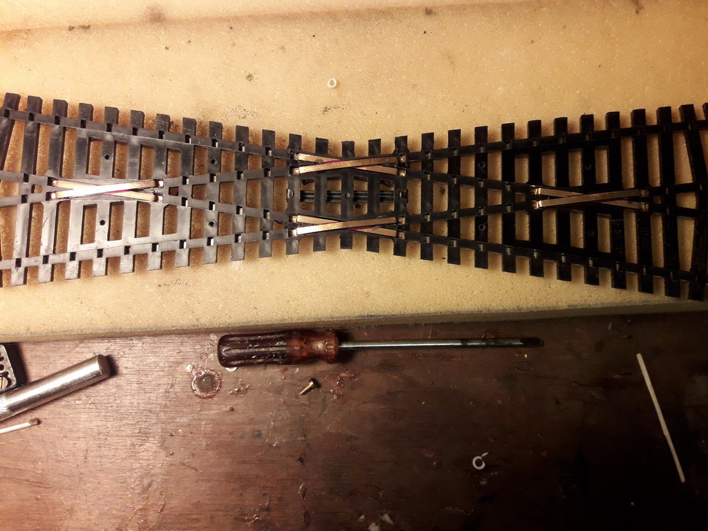 Les cœurs en plastique éliminent tout contact de passage de roue sur deux rails adjacents qui créerait un court circuit. Le dessous montre les lamelles de liaison pour la continuité du rail. Les lamelles se chevauchant sont isolées entre leur face avec un vernis isolant.