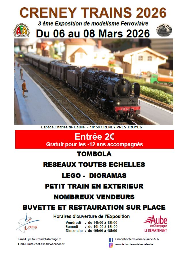 vous invite à découvrir la 3ᵉ exposition de modélisme ferroviaire du 6 au 8 mars 2026 à l’Espace Charles de Gaulle à Creney-près-Troyes.